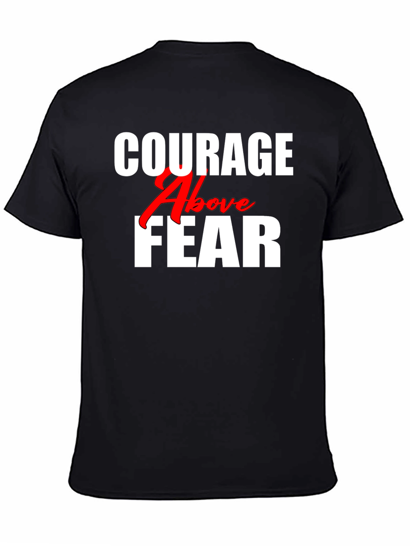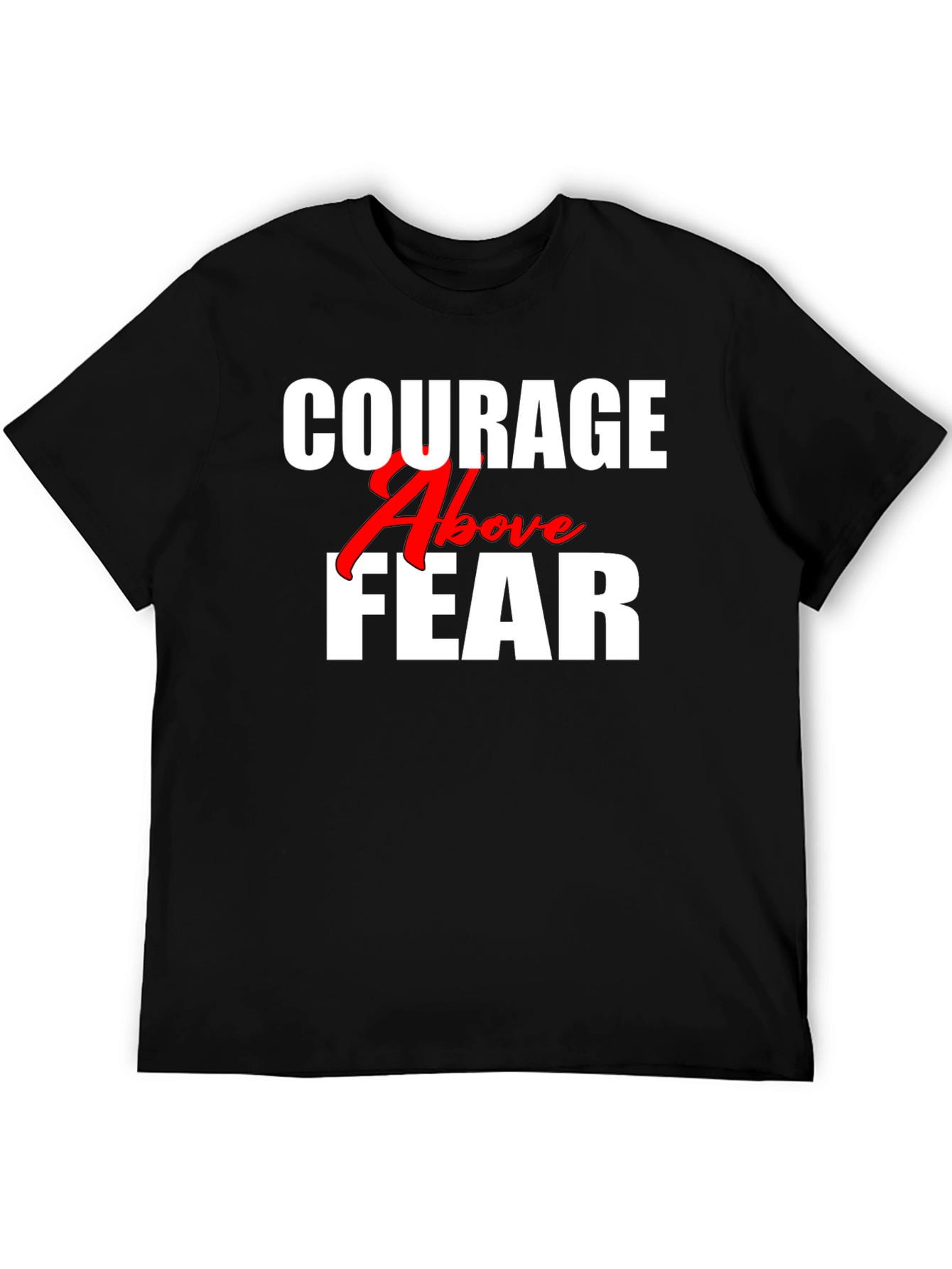 Display your inner strength with this bold graphic tee! The black t-shirt features the words 'COURAGE' and 'FEAR' in a strong, white font, with 'Above' displayed in a striking red script. This classic fit tee is made from what appears to be soft, breathable cotton, making it comfortable for everyday wear. The statement design is perfect for expressing your positive mindset. Wear it to the gym, out with friends, or simply while relaxing at home. This tee is sure to make a statement wherever you go!
