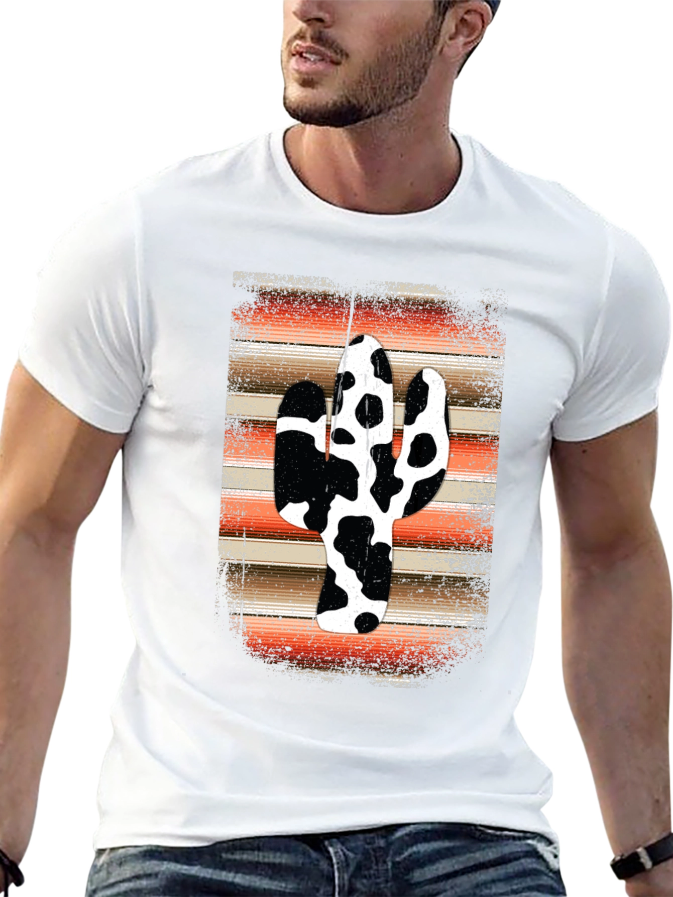 Show off your love for the Wild West with this stylish black graphic tee! The shirt features a unique cactus design with a bold cow print pattern set against a rustic striped background, giving it a vintage, worn look. Perfect for casual wear, rodeos, or anyone who appreciates a touch of country flair. This tee is sure to turn heads with its eye-catching design and comfortable fit. Grab yours today and add some Western charm to your wardrobe!