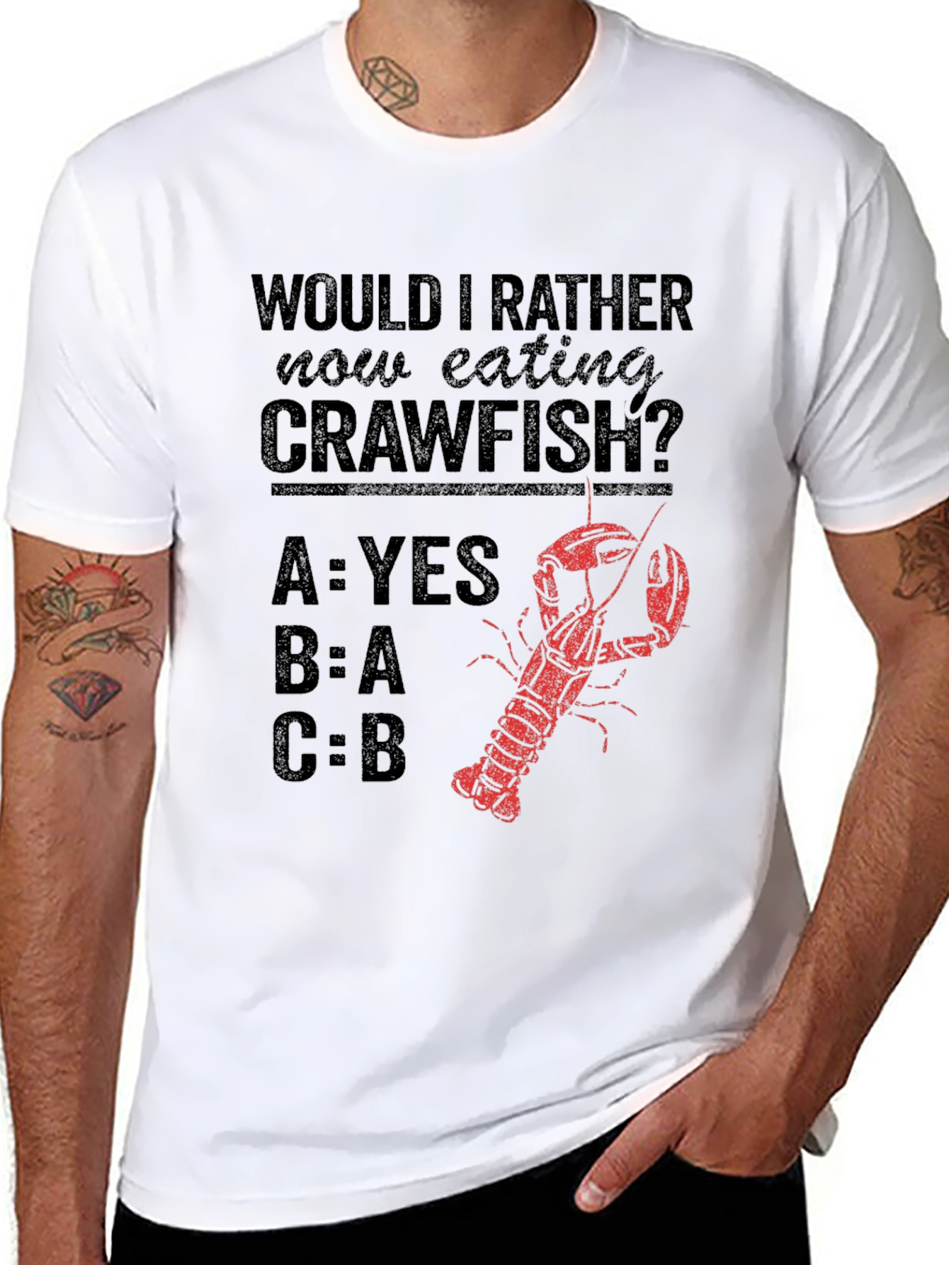 Show off your love for Crawfish with this fun and quirky t-shirt! The black tee features a humorous design with the text 'Would I rather now eating Crawfish? A: Yes, B: A, C: B' along with a vibrant red crawfish graphic. Made from a comfortable, breathable fabric, this shirt is perfect for casual wear, crawfish boils, or as a unique gift for seafood enthusiasts. The witty design is sure to spark conversation and turn heads. Get yours today and let everyone know your love for crawfish!