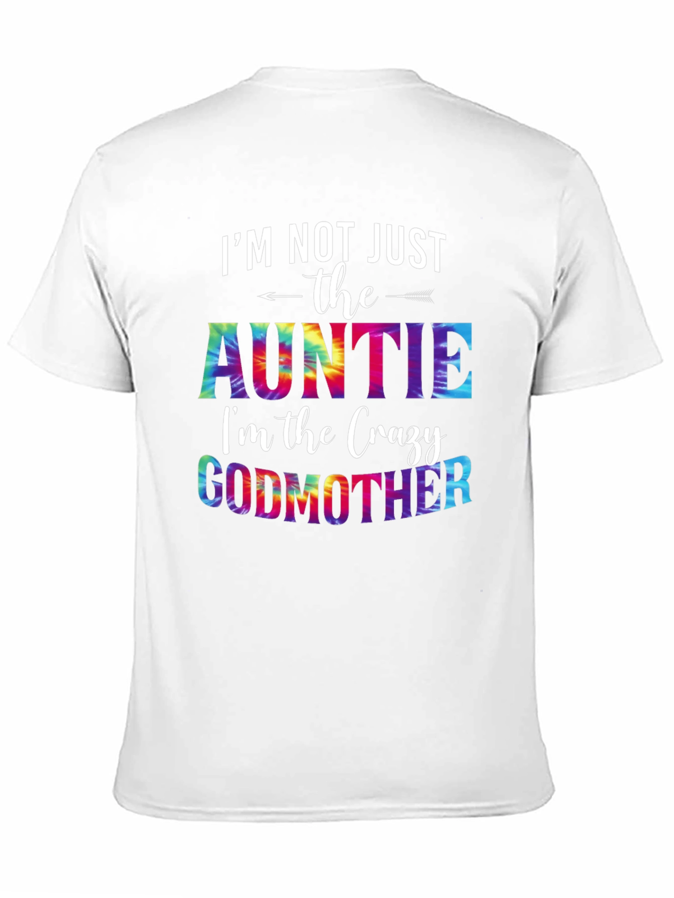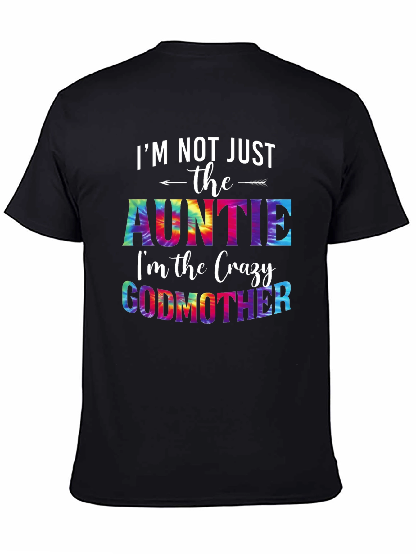 Show off your fun side with this unique graphic tee! The black t-shirt features the playful text "I'M NOT JUST -the- AUNTIE I'm the Crazy GODMOTHER" in vibrant, colorful tie-dye lettering. Made from a soft cotton blend, this tee offers both comfort and style. The casual fit makes it perfect for everyday wear, family gatherings, or even as a humorous gift for the favorite auntie and godmother in your life. Express your playful personality with this eye-catching tee!