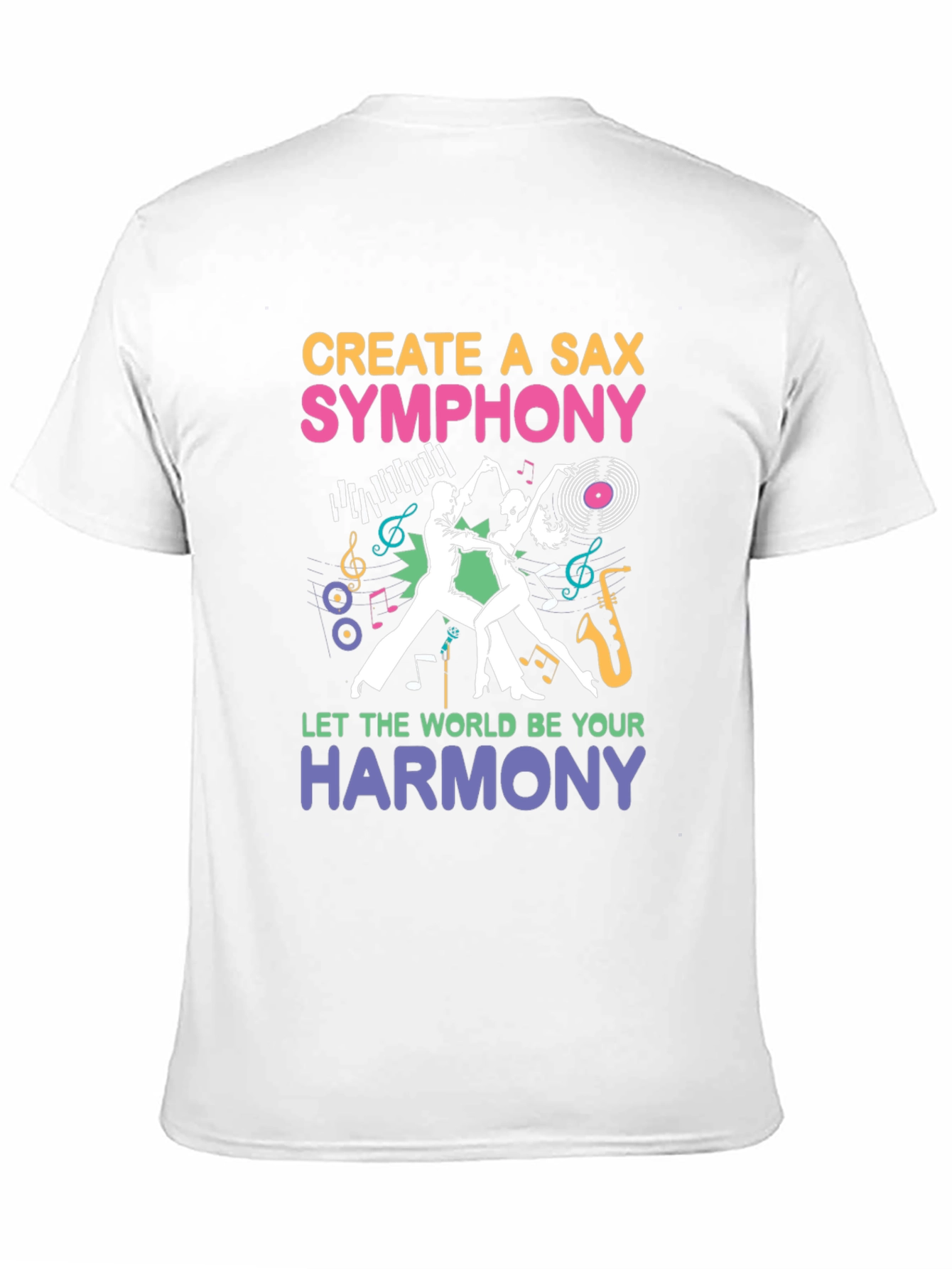 Showcase your love for music with this vibrant and eye-catching t-shirt. This black tee features a colorful design including a saxophone, dancing figures, musical notes, and a record player. The design includes the text: Create a Sax Symphony and Let The World Be Your Harmony. It's perfect for musicians, dancers, or anyone who appreciates a unique graphic tee. Made from a comfortable fabric, this t-shirt is ideal for everyday wear, music events, dance classes, or casual outings. Express your passion for music and stand out in style with this statement piece. Available in various sizes.