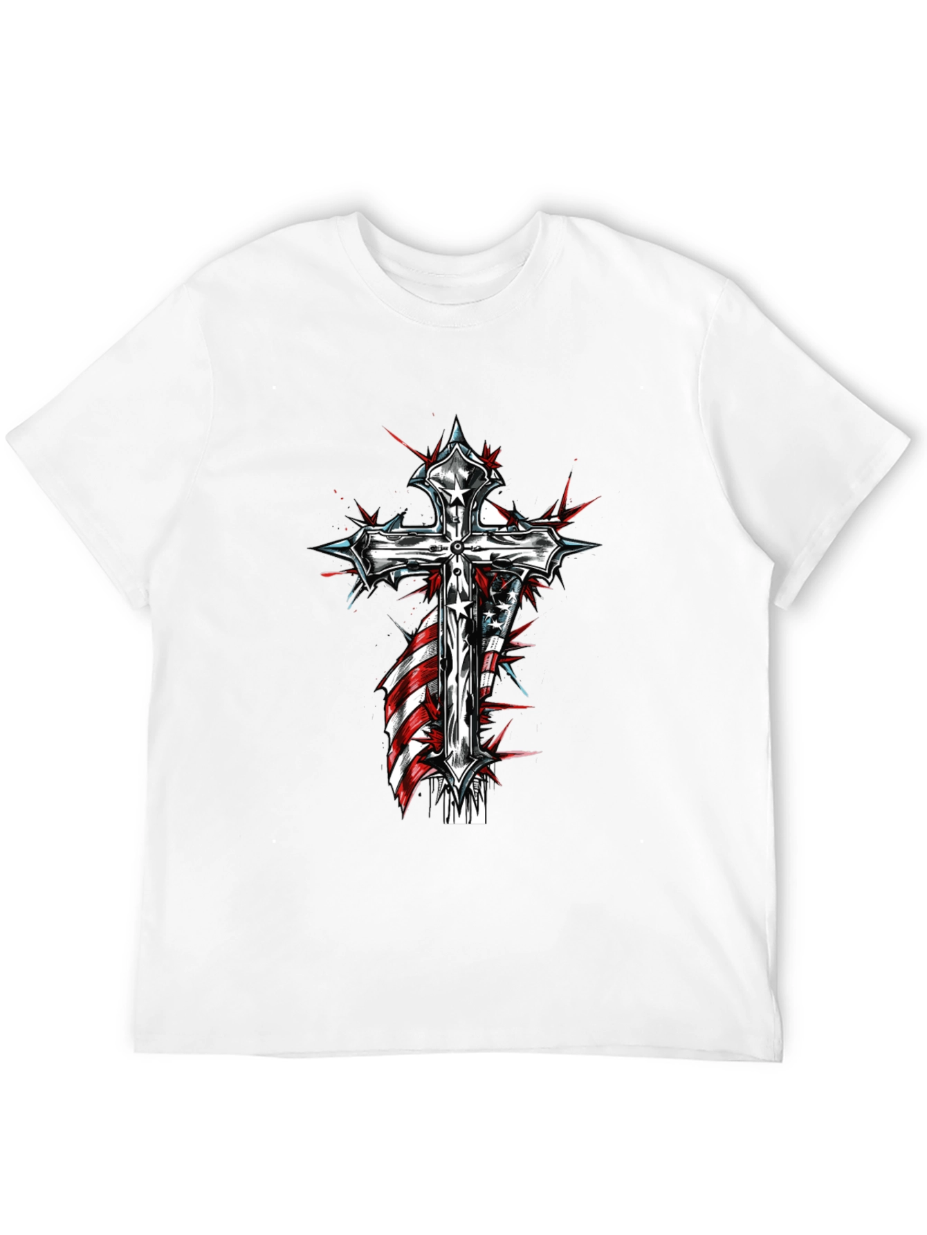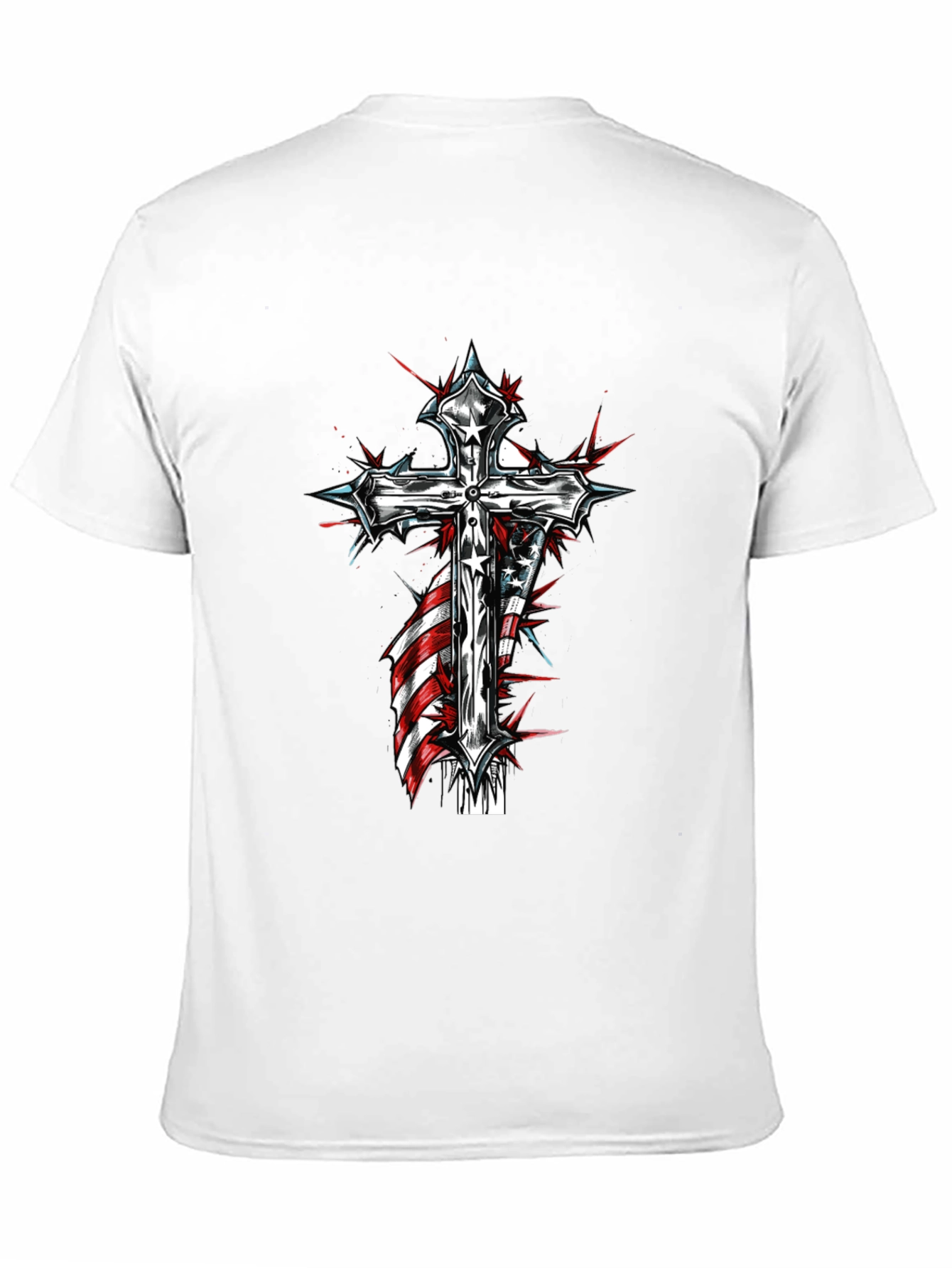 Show your faith and patriotism with this striking black t-shirt. Featuring a detailed graphic print of a silver cross overlaid on the American flag, this shirt is a bold statement piece. The design includes subtle red accents that add an edgy, modern touch. Crafted from a comfortable, breathable fabric, this tee is perfect for everyday wear or special occasions. Pair it with jeans for a casual look, or dress it up with a jacket for a night out. Make a statement with this unique design!