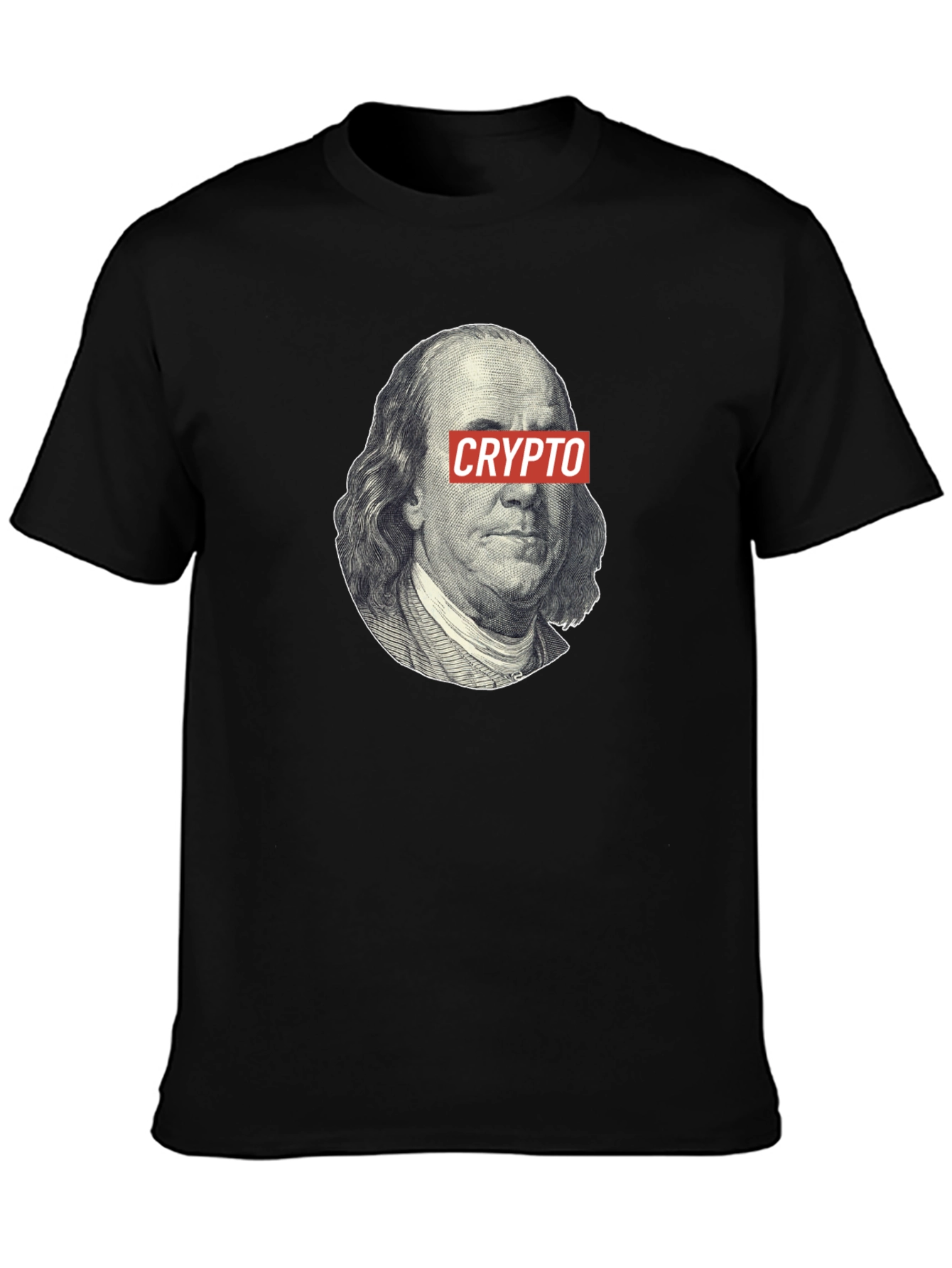 Show your love for crypto with this eye-catching black t-shirt. The design features a detailed portrait of Benjamin Franklin, overlaid with a bold "CRYPTO" graphic. Made from comfortable materials, this tee is perfect for casual wear, crypto meetups, or simply expressing your passion for digital currency. Its unique design is sure to spark conversations and make a statement wherever you go. A must-have for any crypto enthusiast's wardrobe. It is a great addition to any wardrobe and makes a perfect gift for friends and family who are interested in cryptocurrency. The black color provides a versatile canvas for the striking design.
