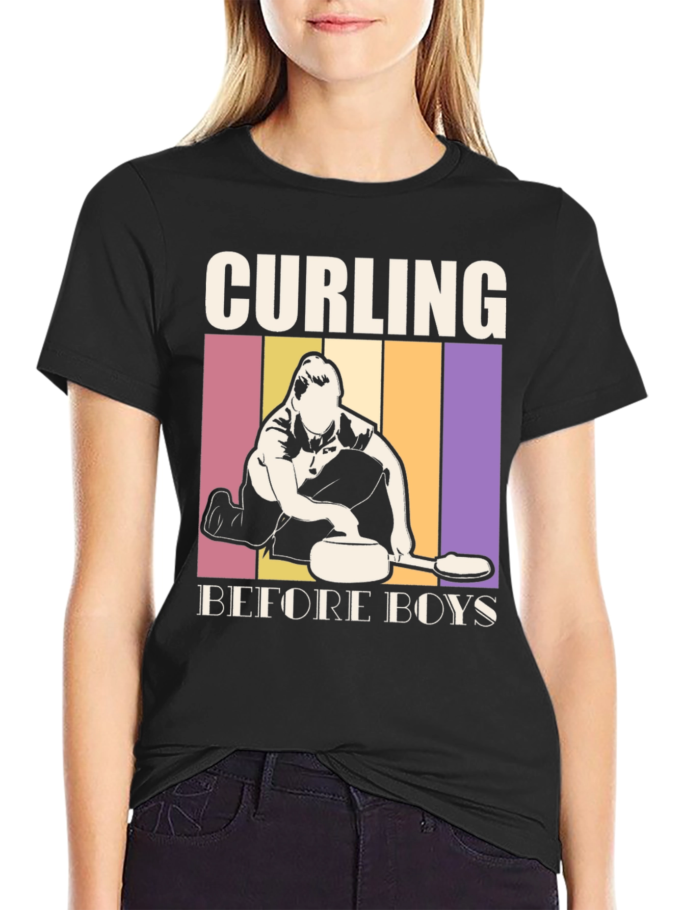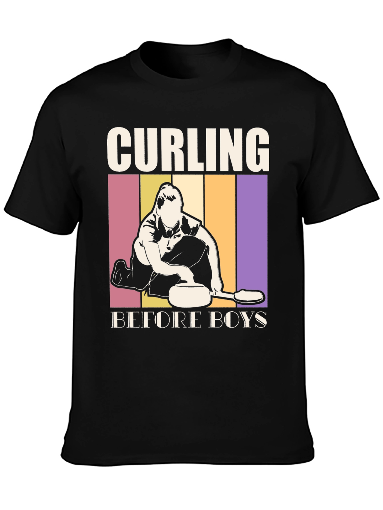 Show off your love for curling with this unique t-shirt! The design features bold "CURLING BEFORE BOYS" text with a graphic of a curler against a retro-striped background. Made from a comfortable-looking material, this short-sleeved shirt is perfect for casual wear or showing your passion at curling events. It's a fun way to express your interests and make a statement. Ideal for curling enthusiasts, athletes, or anyone who enjoys a distinctive and playful design. This tee makes a great gift for the curling lover in your life!