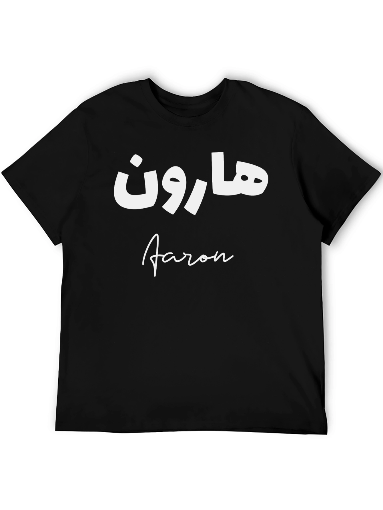 Show off your style with this unique black t-shirt featuring the name "Aaron" in both English and Arabic script. The bold, white lettering offers a striking contrast against the shirt's classic black backdrop. Made from a soft-looking fabric, this tee is comfortable and stylish. Perfect for casual wear or as a personalized gift, this t-shirt is sure to turn heads and spark conversations. It's a unique way to express your identity or celebrate your heritage. The modern design makes it suitable for everyday wear. Get yours today!