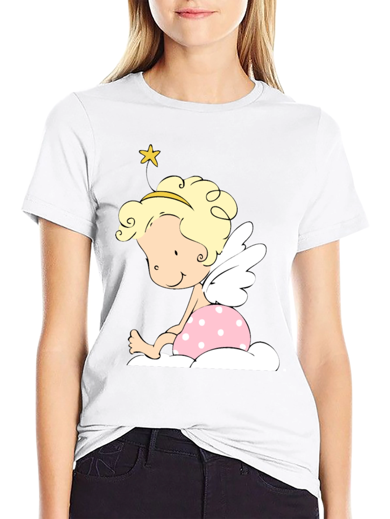Add a touch of whimsy to your wardrobe with this adorable black t-shirt featuring a charming angel graphic. The design showcases a cute cartoon angel with blonde curly hair, perched on a fluffy cloud. The angel graphic adds a playful and lighthearted element to this classic black tee. Made from comfortable, breathable cotton, this unisex t-shirt offers a relaxed fit perfect for everyday wear. Ideal for casual outings, lounging at home, or as a fun gift for anyone who loves unique and cheerful designs. Embrace the playful style of this cute angel tee.
