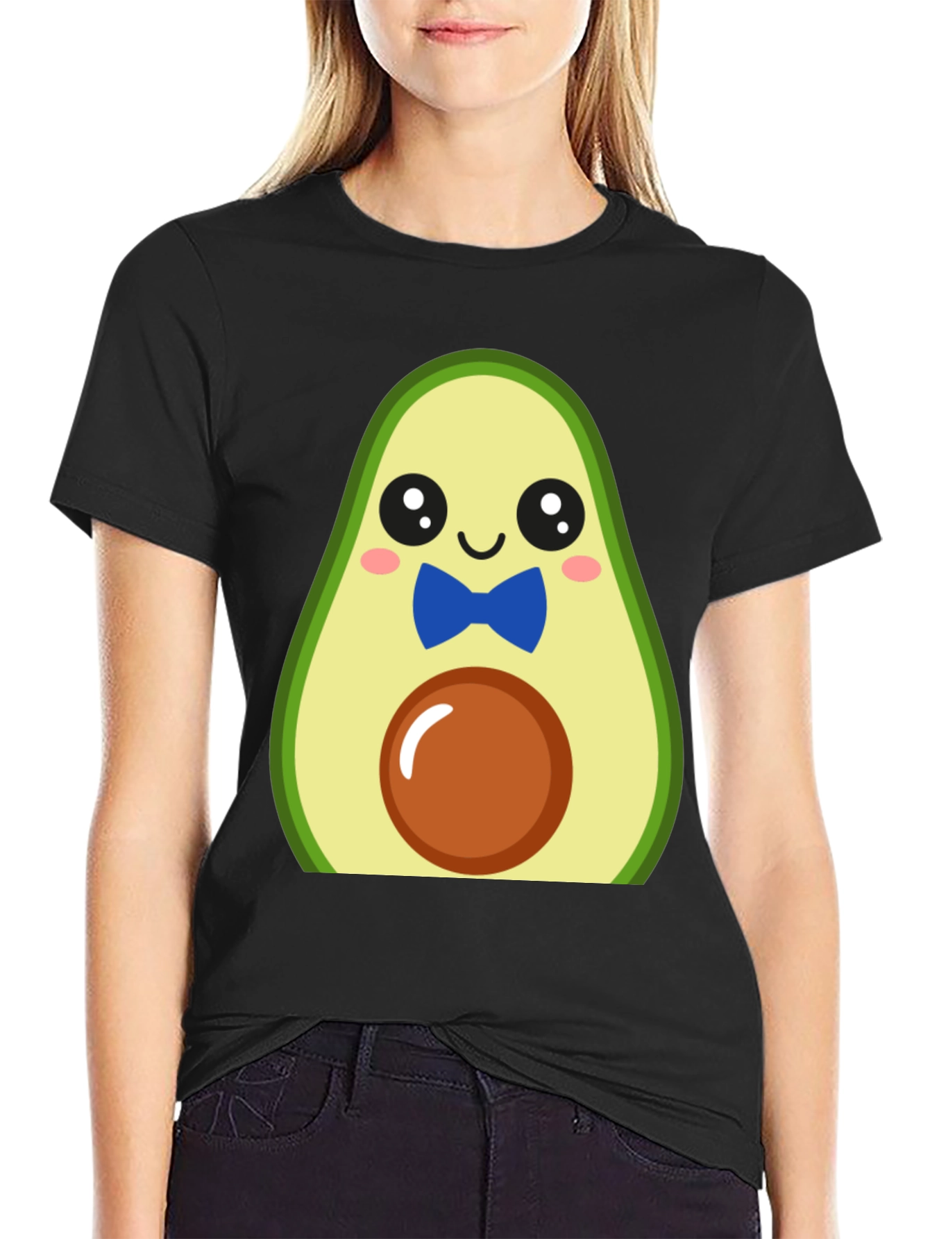 Show off your love for avocados with this adorable men's black t-shirt! This fun tee features a cartoon avocado graphic, complete with big, cute eyes, rosy cheeks, and a stylish blue bow tie. The avocado has a large pit. Made from what appears to be a soft, comfortable fabric, this shirt is perfect for casual wear. Whether you're heading to a weekend brunch, running errands, or just lounging at home, this eye-catching avocado tee is sure to bring a smile to everyone's face. Add a touch of playful style to your wardrobe with this unique and trendy t-shirt.