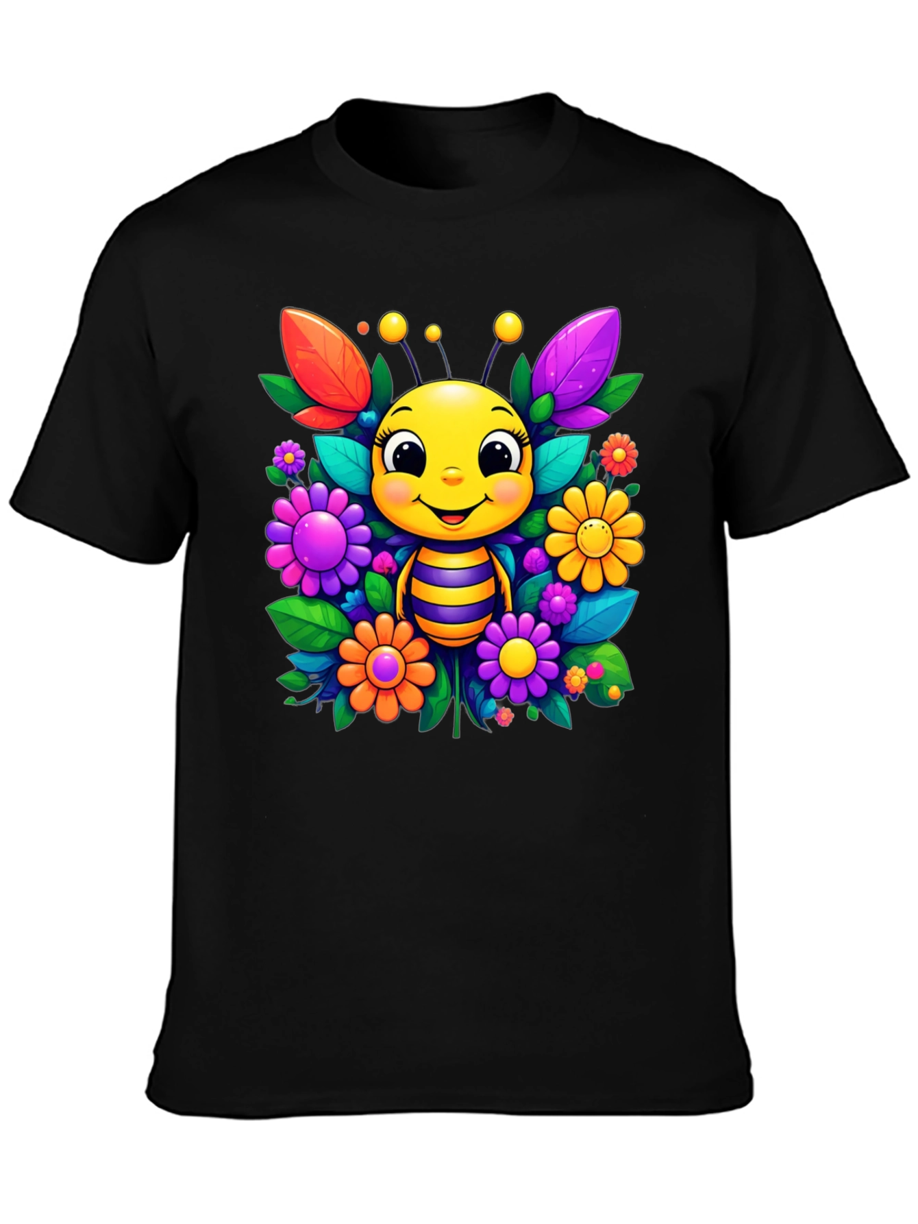 Buzz into style with this adorable black unisex t-shirt! Featuring a vibrant and whimsical design of a cartoon bee surrounded by colorful flowers and leaves, this tee is sure to brighten your day. The cheerful bee boasts a striped body and a sweet smile, nestled amongst purple, orange, and yellow blossoms. The vivid colors pop against the classic black backdrop, making it a fun and eye-catching piece. Made from a soft, comfortable fabric, this shirt is perfect for everyday wear. Whether you're heading to a casual outing, running errands, or simply relaxing at home, this tee is a stylish and comfortable choice. A must-have for bee lovers and anyone who enjoys a touch of playful charm in their wardrobe.