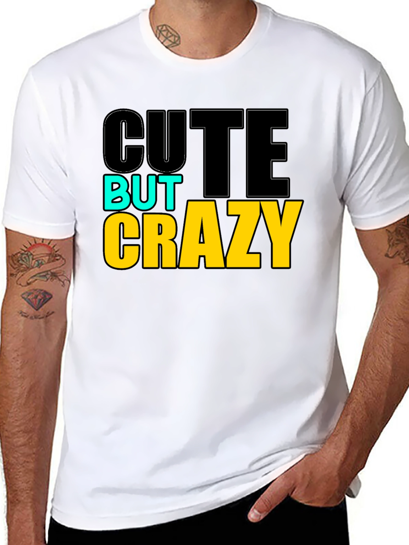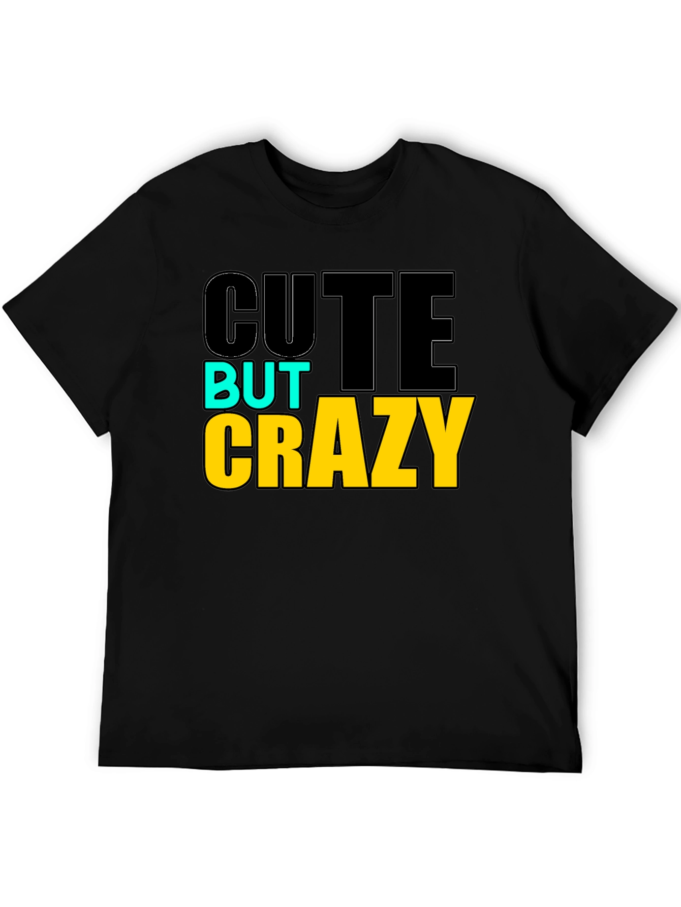 Show off your fun personality with this statement-making t-shirt! This black tee features the phrase "CUTE BUT CRAZY" in a bold, eye-catching design. "CUTE" is printed in a dark, blocky font, "BUT" is in a vibrant turquoise, and "CRAZY" is in a bright yellow. Made from a soft, comfortable fabric, this shirt is perfect for casual wear, expressing your unique style. Wear it to parties, concerts, or just hanging out with friends and get ready to turn heads! Ideal for those with a playful sense of humor.