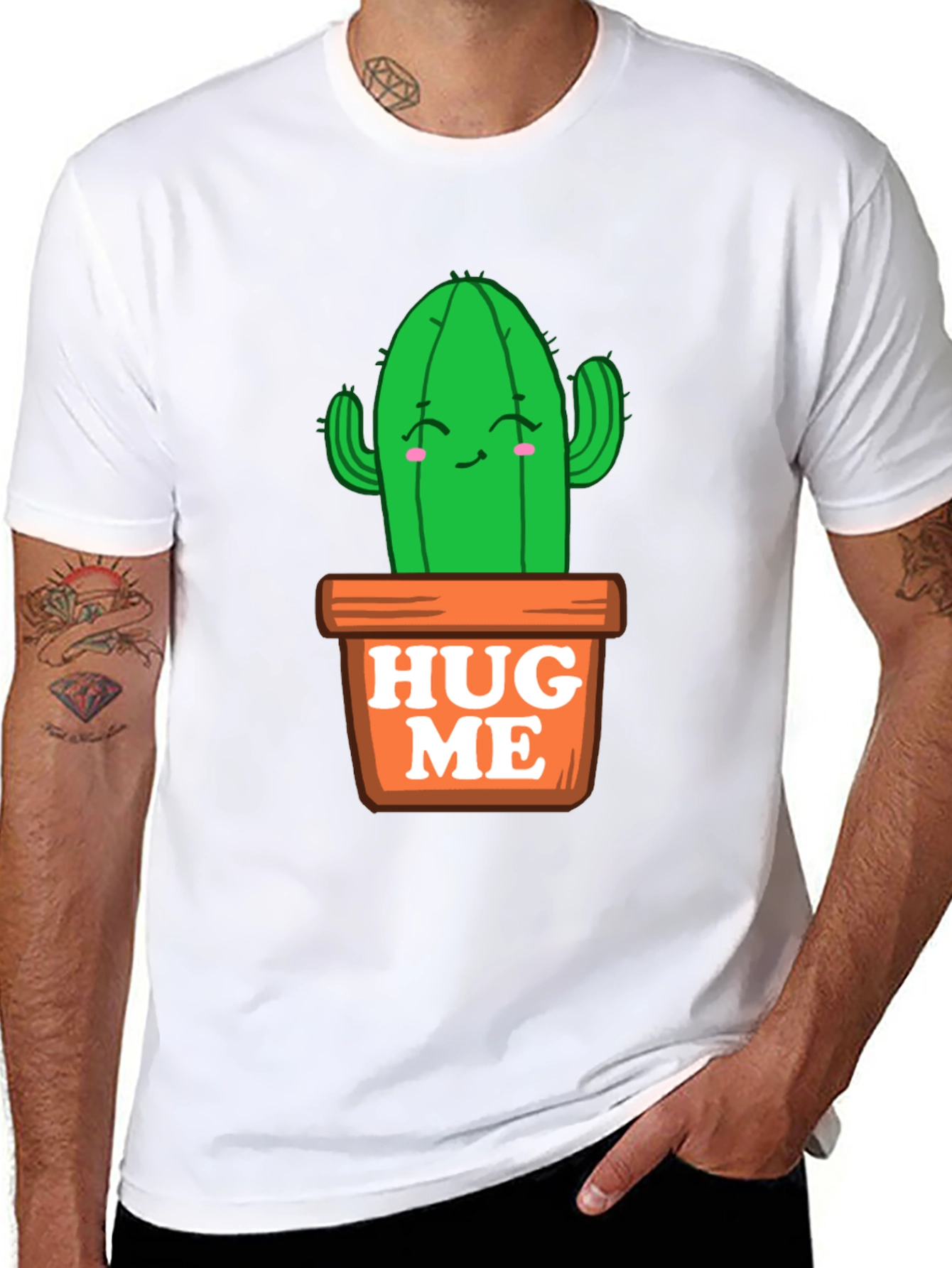 This black t-shirt features a charming cartoon cactus design in a pot that says 'HUG ME'. The cactus is bright green with a smiling face and pink cheeks. Perfect for plant lovers or anyone who appreciates a touch of humor in their wardrobe, this tee is sure to spark conversations. The print is vibrant and eye-catching, made to be durable for repeated wearing and washing. This is a great casual and comfortable option, ideal for everyday wear, outings with friends, or lounging at home.