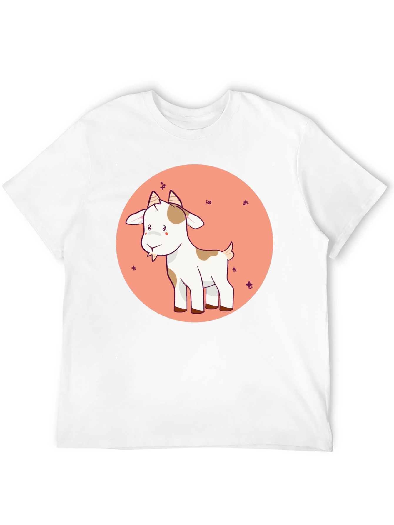 Show off your playful side with this adorable black T-shirt featuring a cute cartoon goat graphic. The goat is set against a peach circle background, adding a pop of color to the design. Made from comfortable, breathable fabric, this tee is perfect for casual wear. The design is playful and unique. It's ideal for animal lovers, or anyone looking to add a touch of whimsy to their wardrobe. Dress it up with jeans, or pair it with shorts for relaxed style.