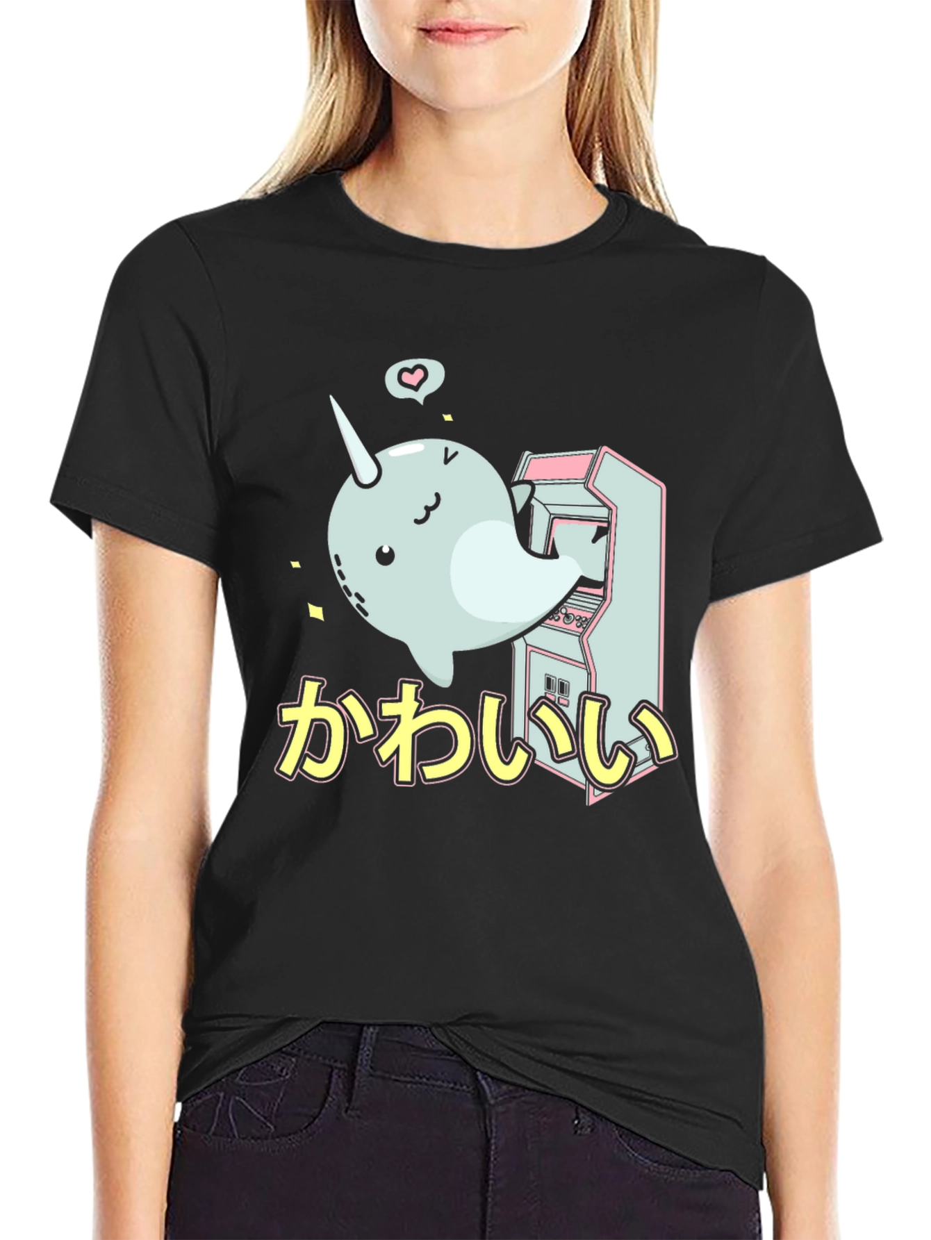 Show off your love for cute and quirky style with this unique graphic t-shirt. Featuring an adorable narwhal character interacting with a vintage arcade game, this shirt is sure to turn heads. The design also includes Japanese text adding to the overall aesthetic. Made from a soft, comfortable fabric, this tee is perfect for casual wear, gaming sessions, or adding a touch of whimsy to any outfit. Makes a great gift for fans of narwhals, kawaii culture, and retro games. Get yours today and add some fun to your wardrobe!