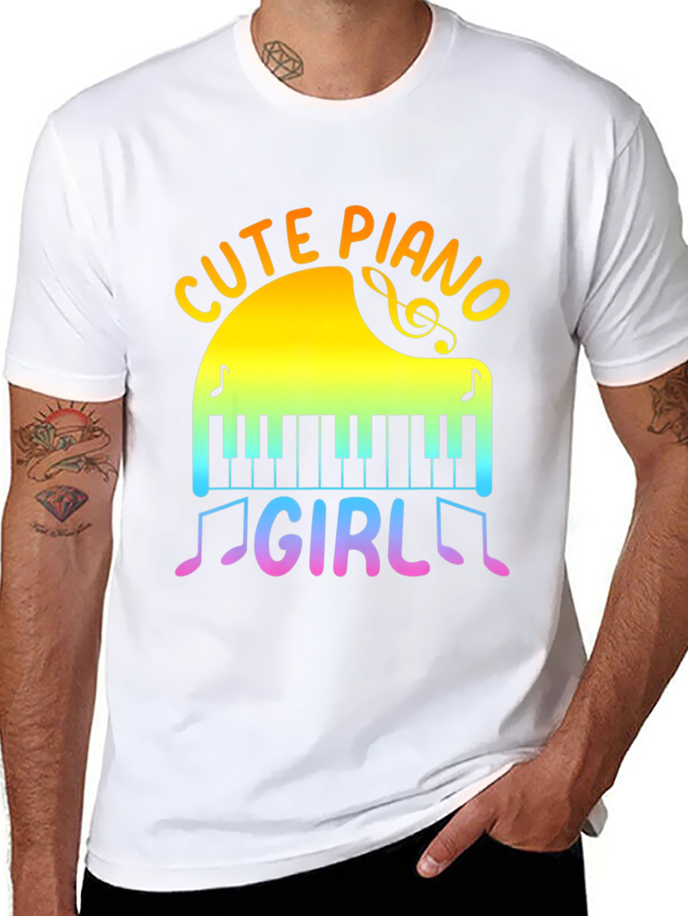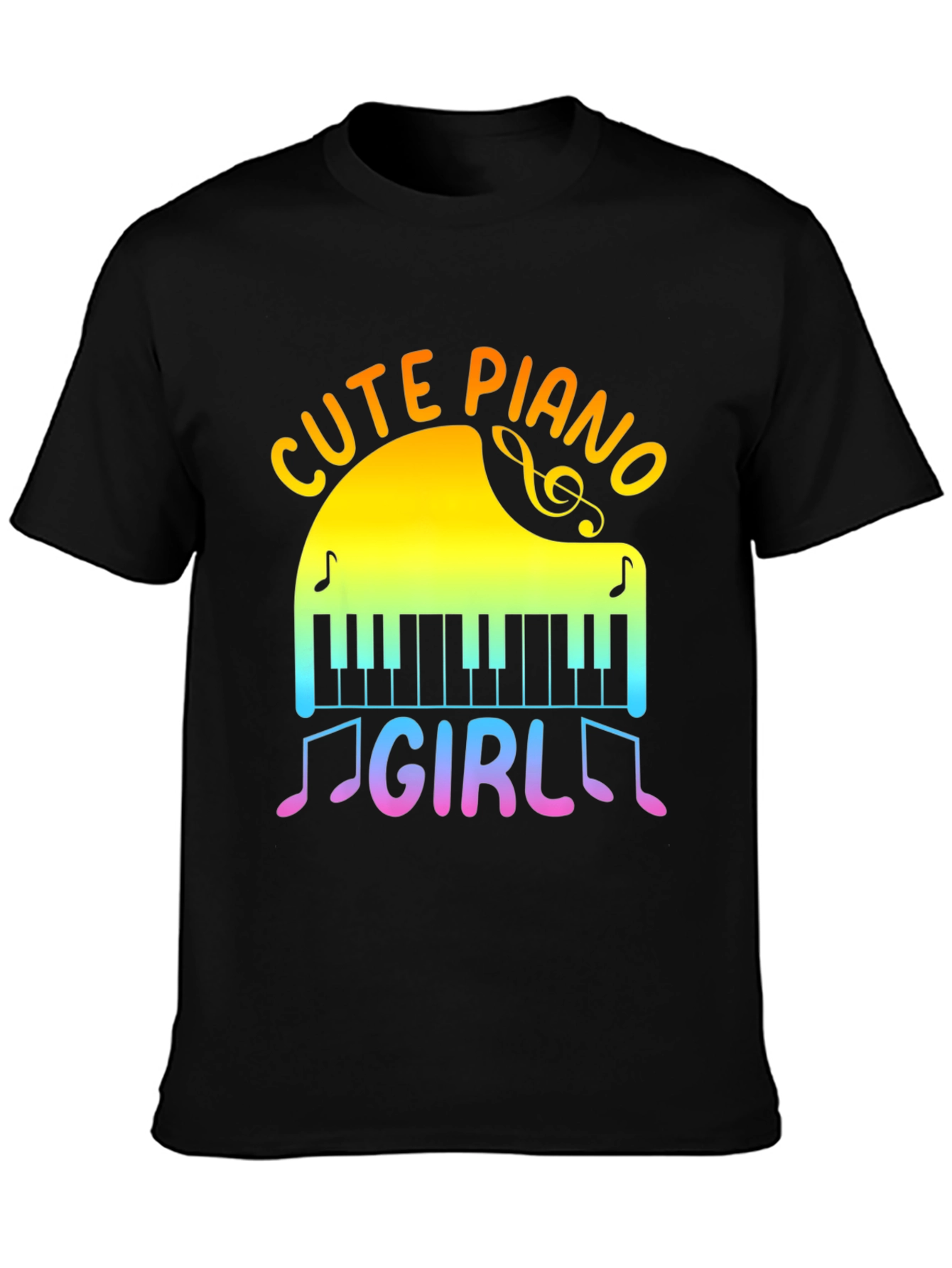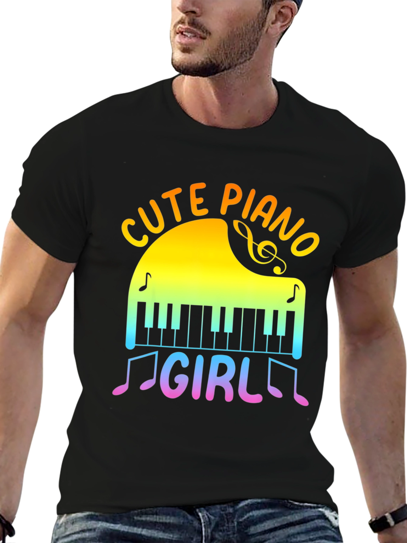 Show off your love for music with this eye-catching "Cute Piano Girl" T-shirt. The design features a vibrant rainbow-colored piano graphic, complete with musical notes and the word "GIRL". The design is perfect for pianists, music lovers, or anyone who appreciates a fun and playful tee. Made from soft, comfortable fabric, this shirt is ideal for everyday wear, music lessons, or casual outings. Get yours today and let your passion for music shine!