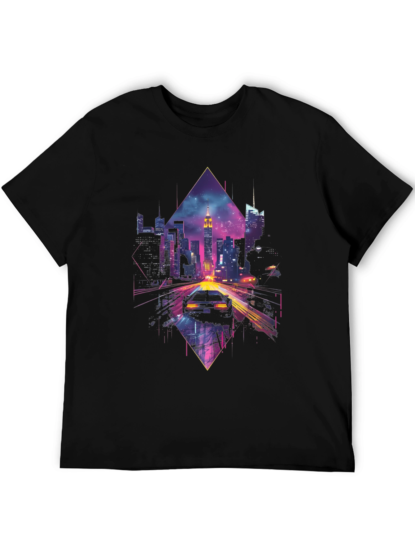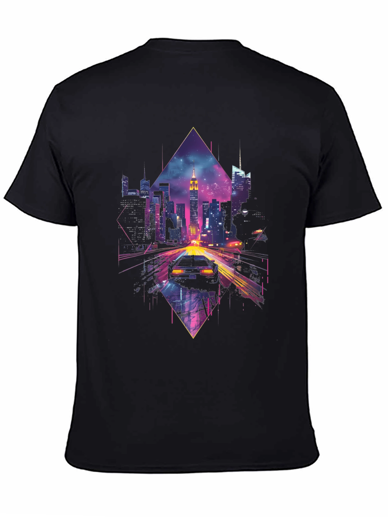 Immerse yourself in the neon-lit world of tomorrow with this unique t-shirt. The design features a retro-futuristic cityscape reminiscent of classic cyberpunk aesthetics. A sleek sports car races towards the glowing skyline, set against a geometric diamond backdrop. The vibrant purples, blues, and pinks create a stunning visual contrast with the black cotton tee. Perfect for anyone who loves science fiction, retro wave, or unique statement pieces. Wear it to a convention, a night out, or just to express your love for all things cyberpunk. This t-shirt is sure to turn heads and spark conversations.