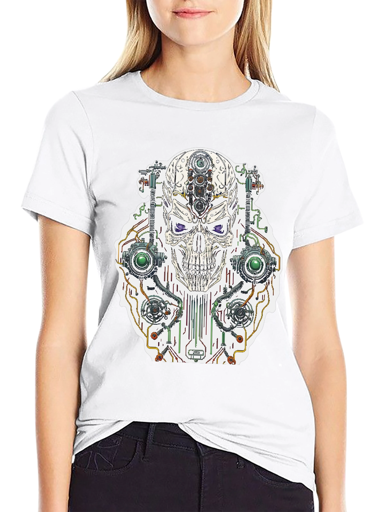 Stand out with this unique cyberpunk-inspired graphic tee! Featuring a detailed skull design intertwined with futuristic mechanical elements, this shirt is perfect for sci-fi fans and those who appreciate edgy style. The intricate artwork combines a skeletal face with gears, wires, and glowing green accents, creating a visually striking effect. Made from a comfortable, dark fabric, this t-shirt is ideal for casual wear, concerts, or making a statement. Showcase your individuality with this eye-catching piece that blends the macabre with cutting-edge aesthetics.