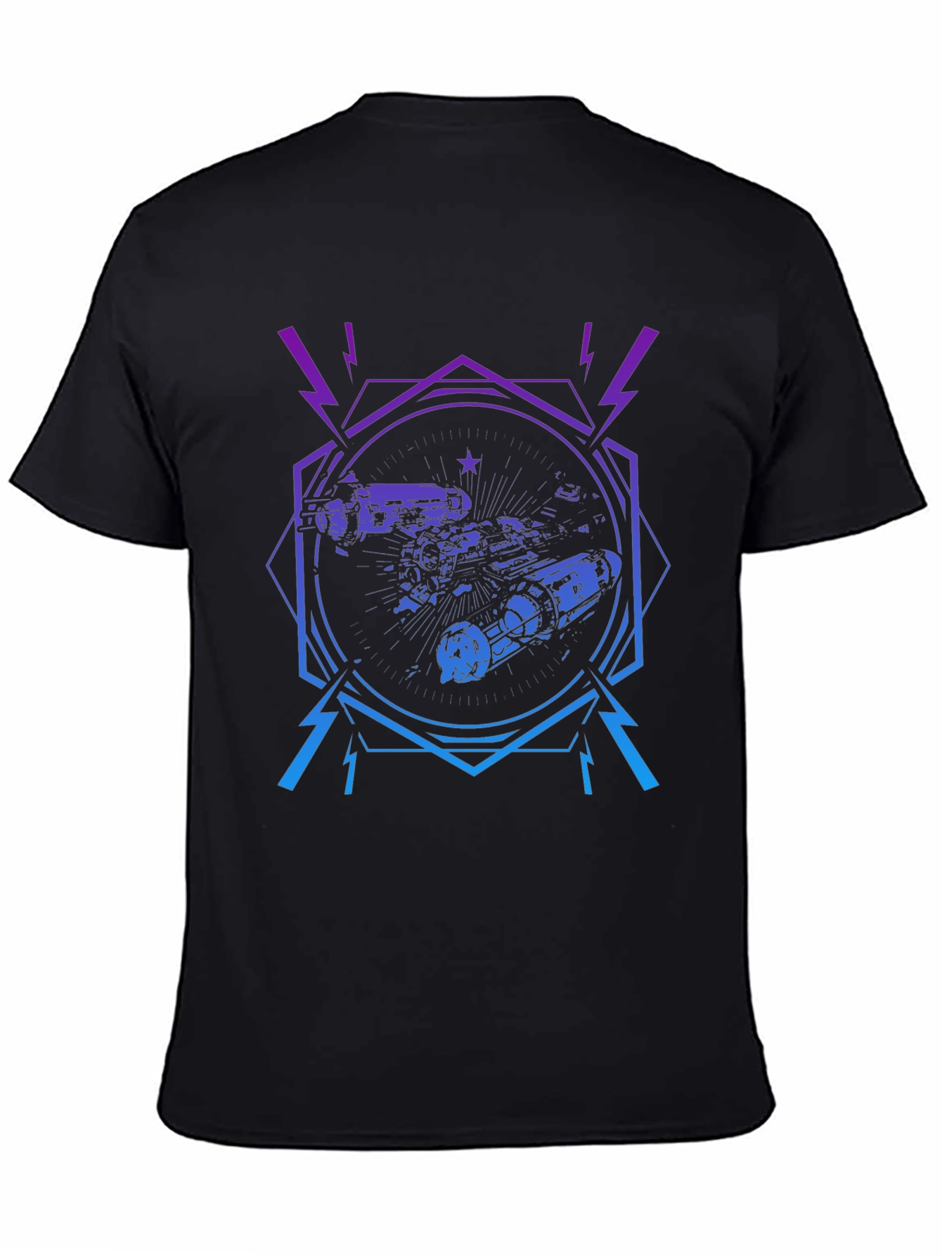 This striking black t-shirt features a futuristic cyberpunk-inspired graphic. The design showcases a detailed spaceship at the center, encircled by geometric shapes and electrifying bolt accents. The graphic uses a vibrant purple and blue gradient that adds a modern and eye-catching element to the overall aesthetic. Made from a comfortable-looking fabric, this tee is ideal for casual wear. Its unique design makes it a great conversation starter, perfect for science fiction fans, gamers, or anyone with an appreciation for bold, artistic apparel. Rock this tee at conventions, casual hangouts, or while exploring your own digital world. Add this tee to your wardrobe and make a statement!