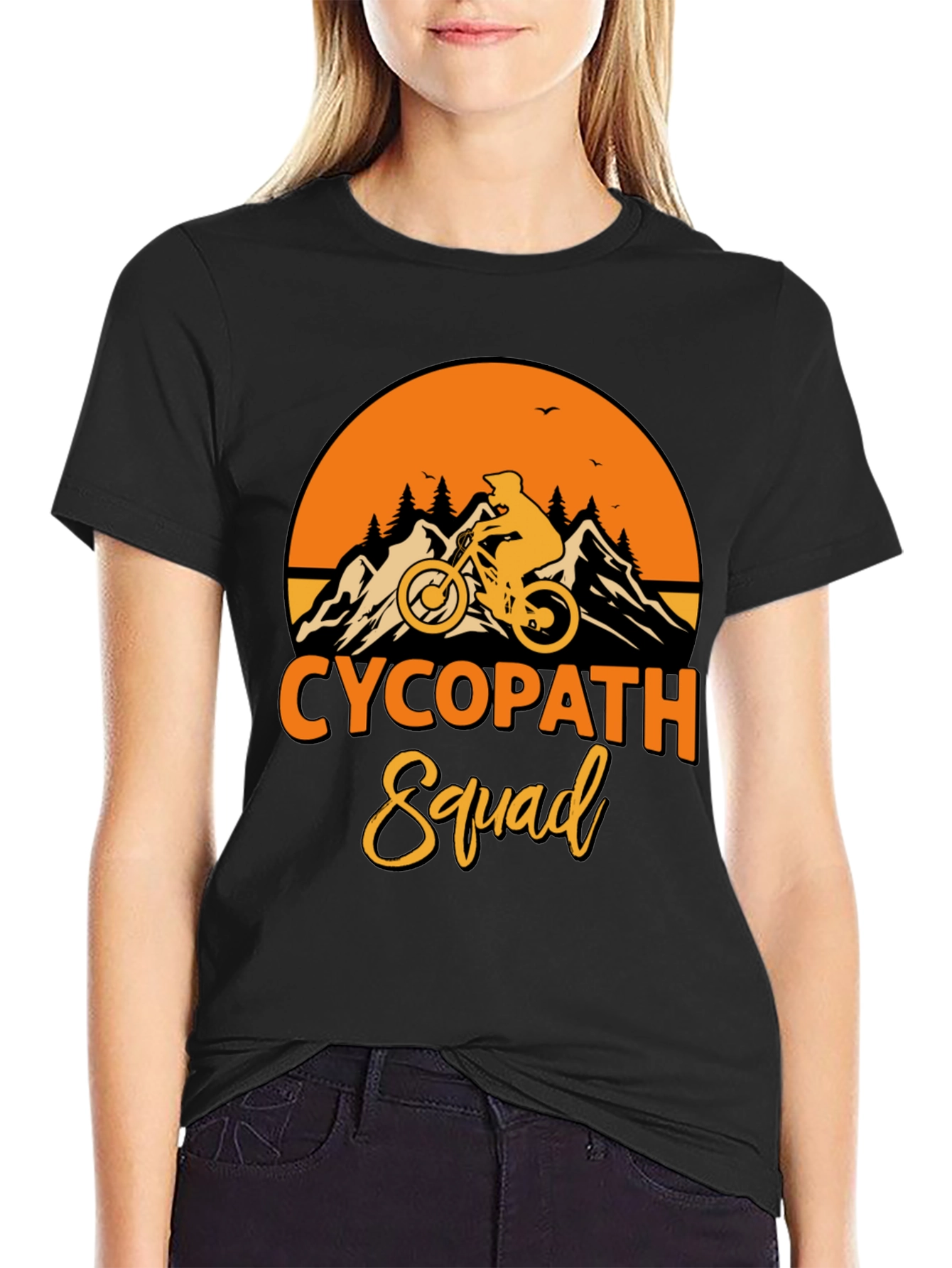 Show your love for mountain biking with this unique t-shirt! Featuring a stylized design of a mountain biker against a sunset backdrop, surrounded by mountains and trees. The words "Cyclopath Squad" are printed in a bold, eye-catching font. Made from a comfortable, dark-colored fabric, this shirt is perfect for casual wear, outdoor adventures, or cycling events. A great conversation starter and a must-have for any cycling enthusiast's wardrobe. Get yours today and ride in style!