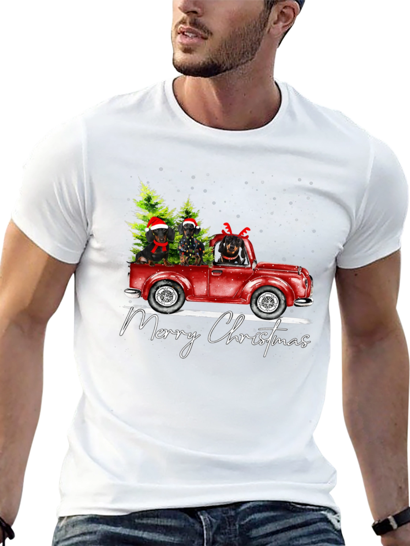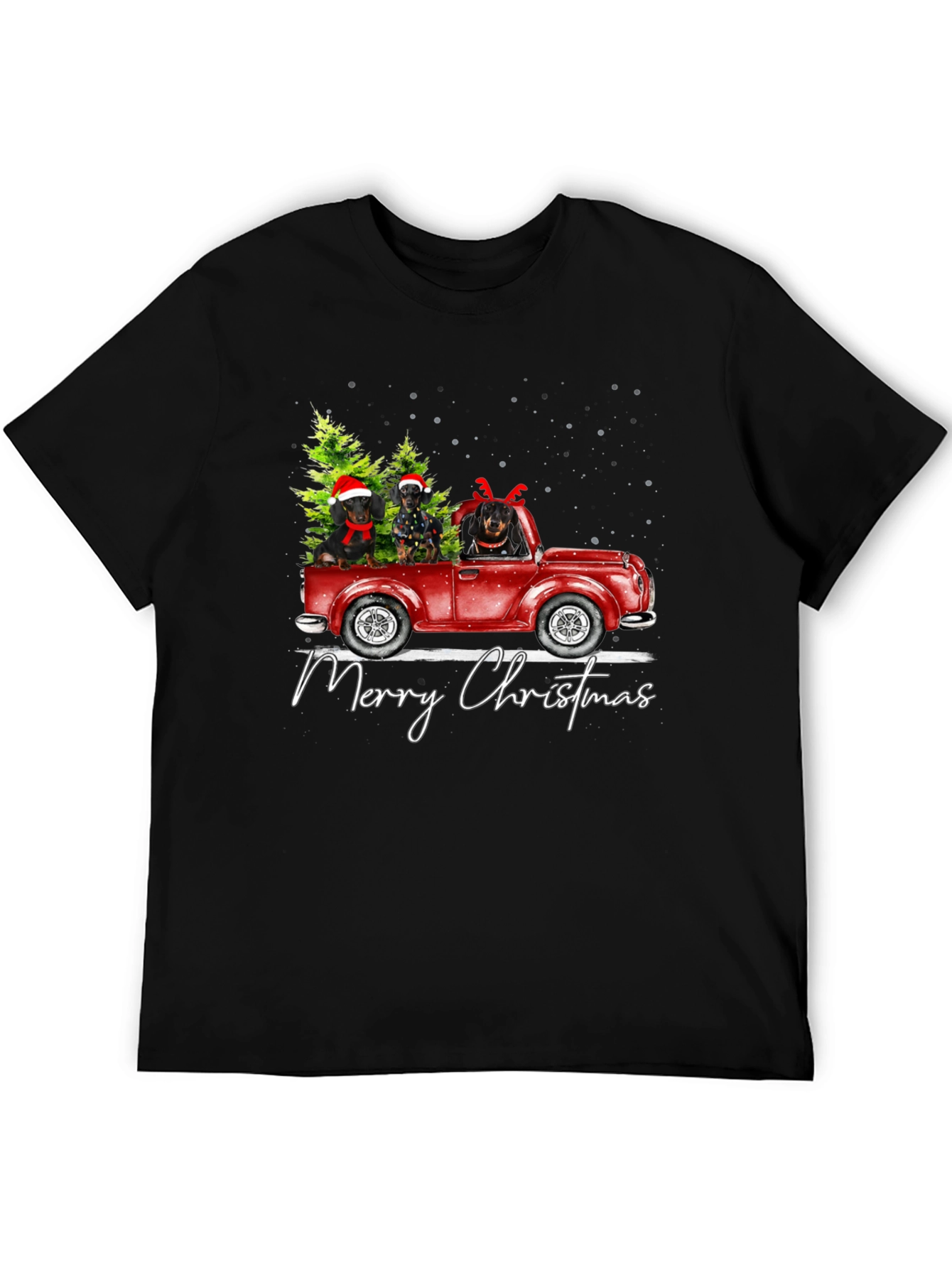 Spread some holiday cheer with this unique graphic tee. This black t-shirt features an adorable image of three dachshunds riding in a red vintage truck, complete with a Christmas tree and holiday accessories. Below the truck is a "Merry Christmas" script, making it the perfect attire for Christmas parties, family gatherings, or casual holiday outings. Made from soft, breathable fabric, this tee offers both comfort and style. A must-have for dog lovers and anyone looking to add a festive touch to their wardrobe this season!