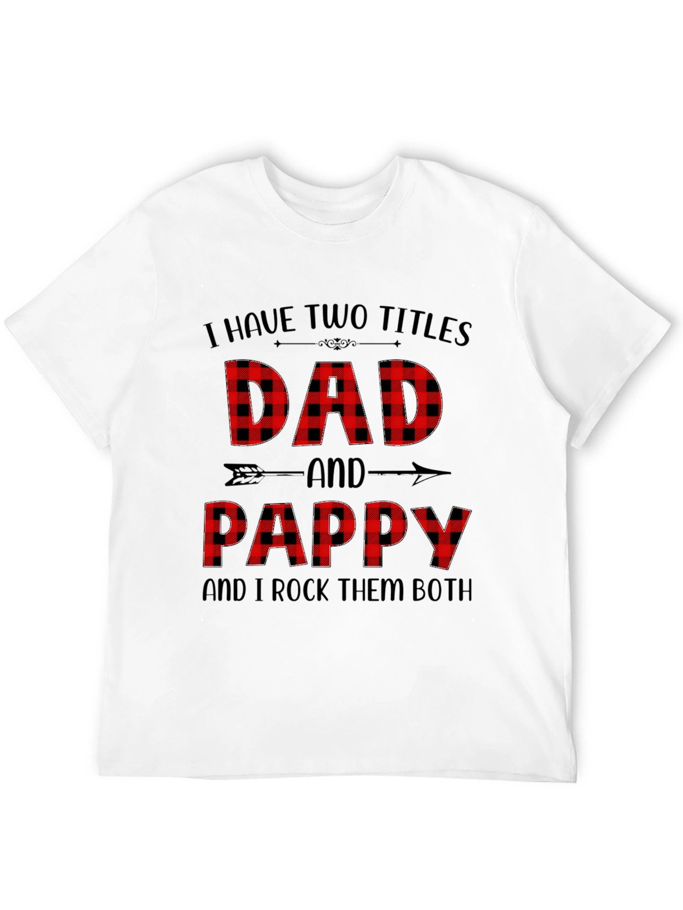 Show off your dual role with this stylish black t-shirt! Featuring the phrases "I HAVE TWO TITLES DAD AND PAPPY AND I ROCK THEM BOTH", this tee celebrates fatherhood and grand-fatherhood. The words "DAD" and "PAPPY" are uniquely designed with a vibrant red and black buffalo plaid pattern, creating a bold and eye-catching statement. An arrow separates Dad and Pappy. Crafted from a soft, comfortable fabric, it's perfect for everyday wear. Whether you're spending time with family or running errands, this shirt is sure to turn heads and spark conversation. A must-have for any proud dad and pappy!