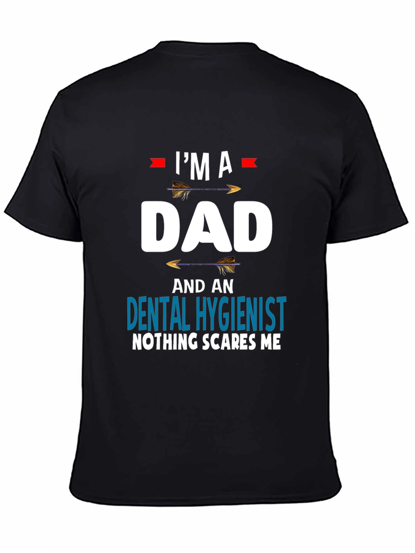 This black T-shirt features a bold and humorous design, perfect for the dental hygienist dad in your life. The shirt proudly proclaims "I'M A DAD" in large white letters, punctuated by playful arrow graphics. Below, "AND AN DENTAL HYGIENIST" is displayed in a striking blue hue, followed by the confident statement "NOTHING SCARES ME" in white. Made from what appears to be a soft and comfortable cotton blend, this tee offers a relaxed fit for everyday wear. It's an ideal gift for Father's Day, birthdays, or just to show appreciation for the hardworking dental professional who tackles parenthood with fearless enthusiasm. Wear it with pride and a smile!