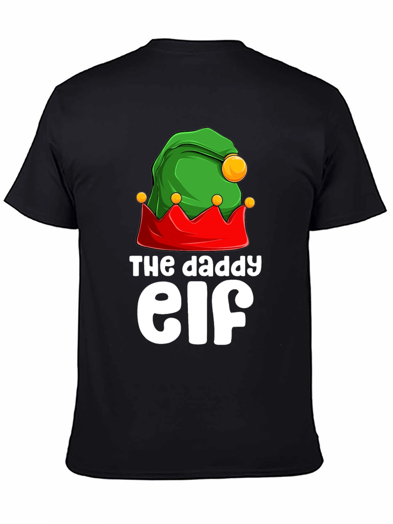Spread some holiday cheer with this fun 'Daddy Elf' T-shirt! This black tee features a whimsical design of an elf hat in vibrant green and red, complete with playful yellow pom-poms. The text 'THE DADDY elf' is printed in bold white letters. Made from a comfortable-looking fabric, this tee is perfect for family gatherings, holiday parties, or simply showing off your festive spirit. Get ready to bring smiles and laughter wherever you go this Christmas season. It makes a great gift for dads and elf-enthusiasts!