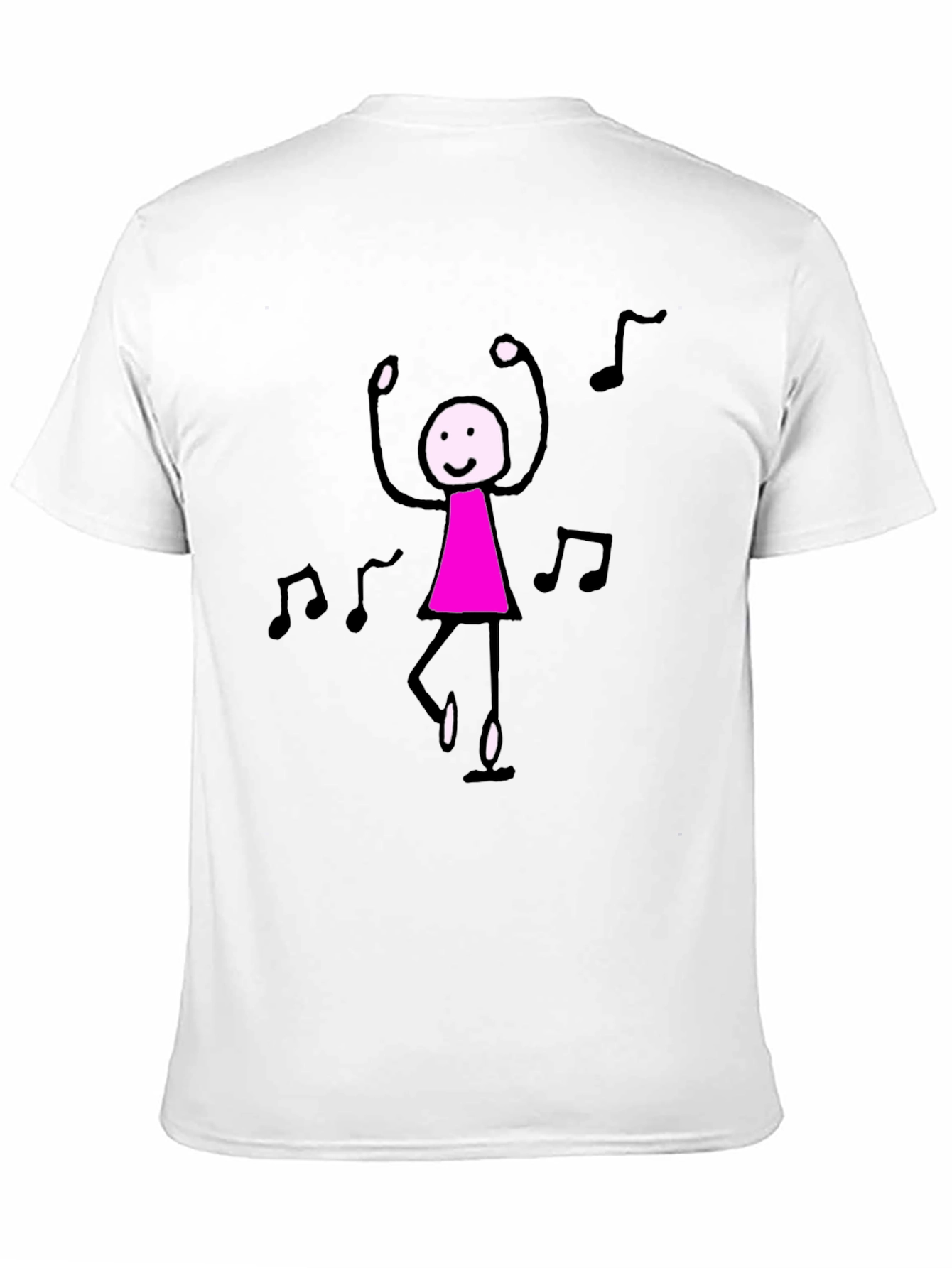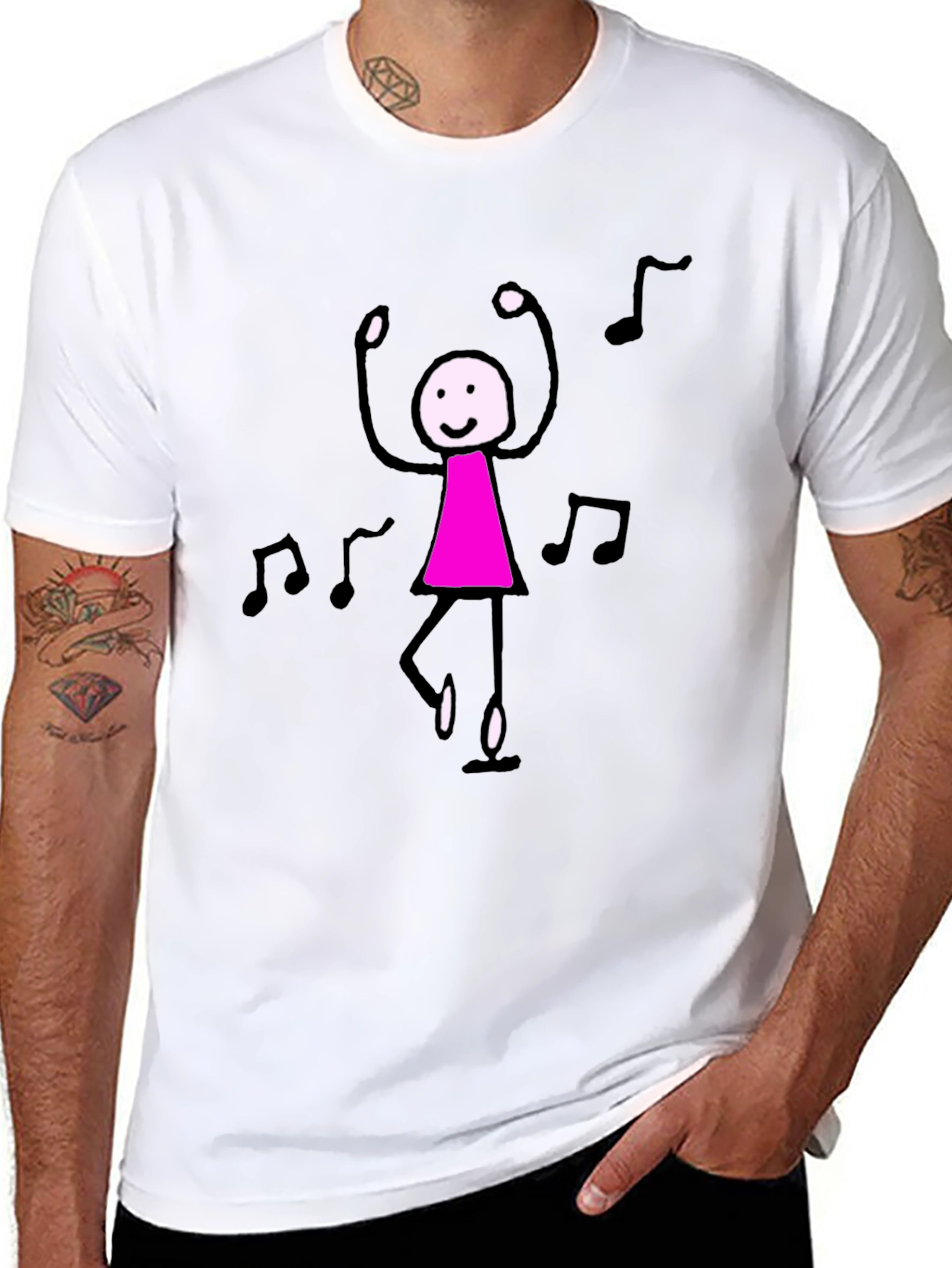 Show off your playful side with this fun black graphic tee. This unique t-shirt features a whimsical stick figure dancing to music notes, making it a great conversation starter. The bright pink dress adds a pop of color, ensuring this tee stands out. Made from comfortable material, it's perfect for casual outings, dance classes, or just lounging around. Get yours today and let your inner child shine!