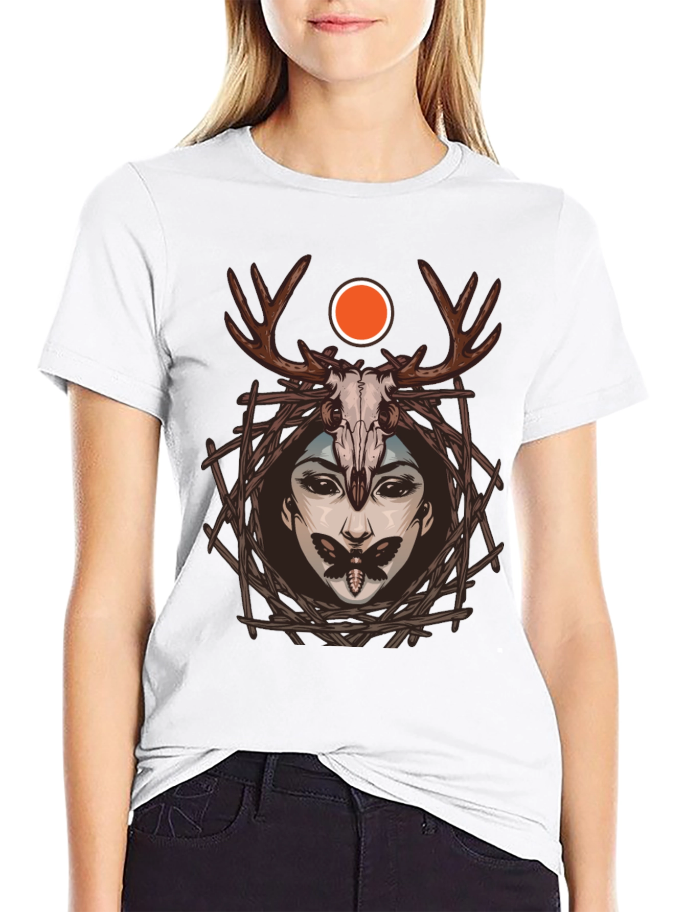 Embrace a darkly elegant style with this unique graphic tee. The design features a stylized woman's face overlaid with an antlered skull and a prominent moth, all framed by interwoven branches. A striking orange circle adds a touch of contrast. The tee is made from a soft, comfortable fabric, perfect for everyday wear. It's an ideal choice for those who appreciate gothic, pagan, or alternative fashion. Stand out from the crowd and express your individuality with this eye-catching and distinctive shirt. Pair it with jeans, leggings, or a skirt for a versatile and effortlessly cool look.