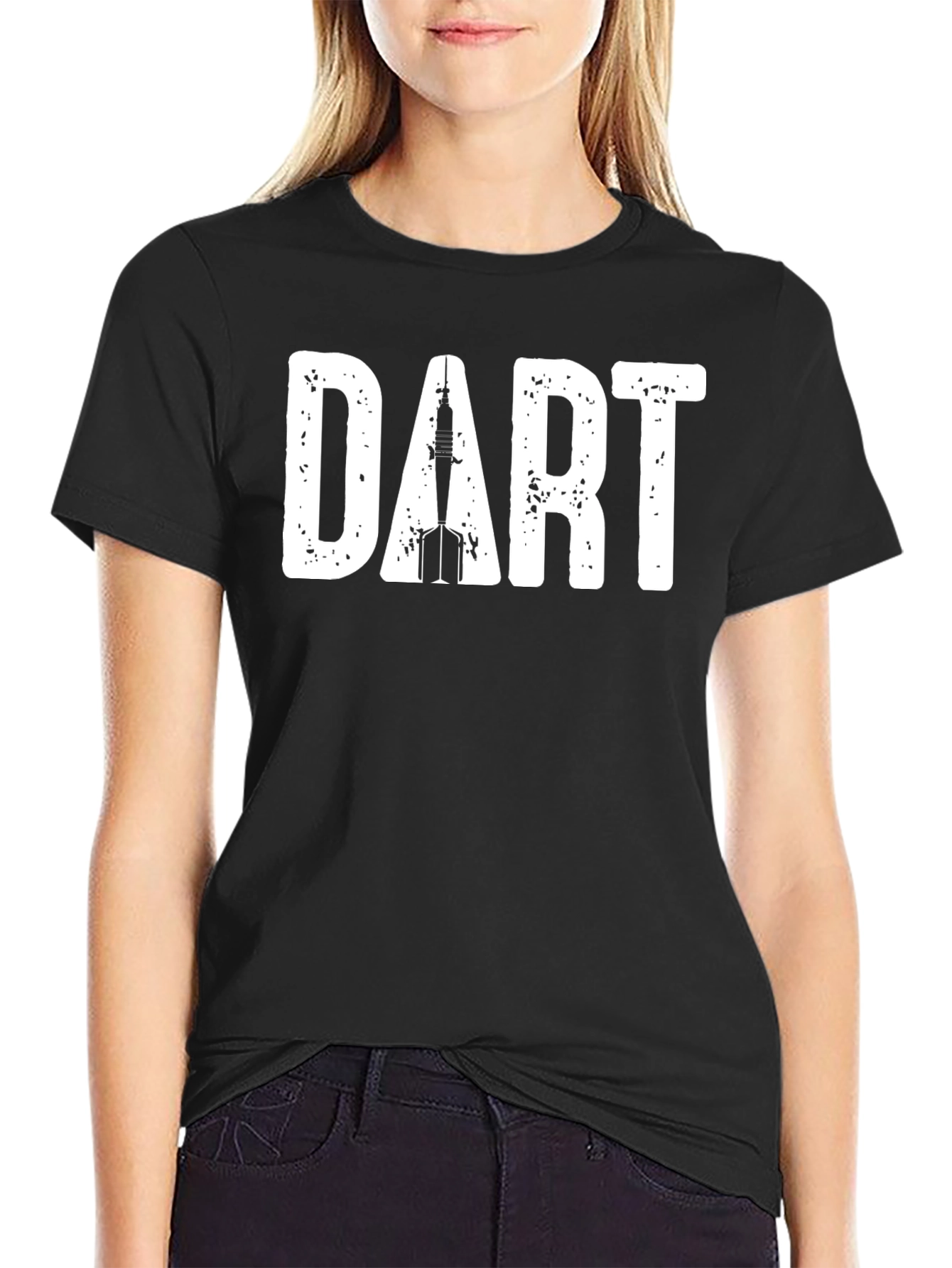 Show off your love for darts with this stylish black graphic tee. The shirt features the word "DART" in a bold, distressed white font, with the "A" creatively replaced by a dart graphic. Made from a comfortable fabric, this tee is perfect for casual wear, game nights, or just lounging around. The classic crew neck and short sleeve design make it a versatile addition to any wardrobe. Whether you're a seasoned dart player or simply appreciate unique designs, this t-shirt is sure to make a statement.