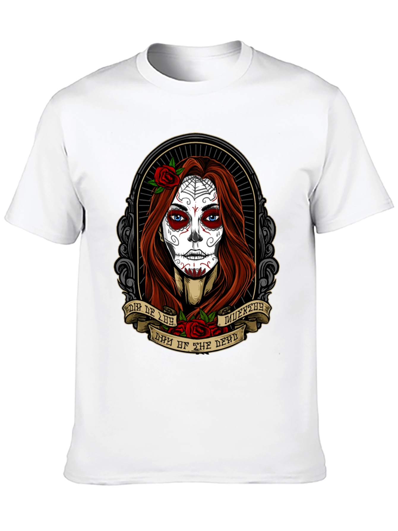 Embrace the spirit of Día de los Muertos with this striking black t-shirt. Featuring a captivating graphic of a sugar skull woman adorned with roses and intricate details. The design, set within an ornate frame, showcases the iconic "Day of the Dead" inscription, blending tradition with modern style. Made from a soft, comfortable fabric, this tee is perfect for expressing your unique personality. Wear it to cultural events, celebrations, or as a bold fashion statement. A must-have for anyone who appreciates art, culture, and distinctive apparel. Get yours today!