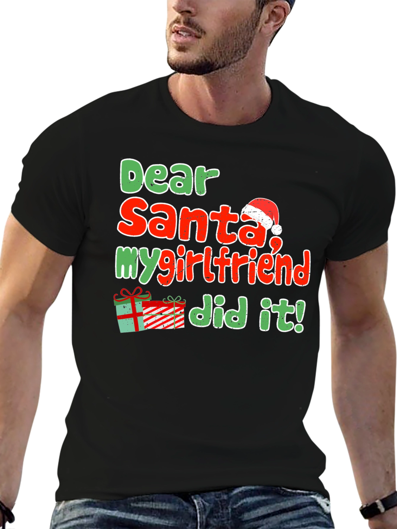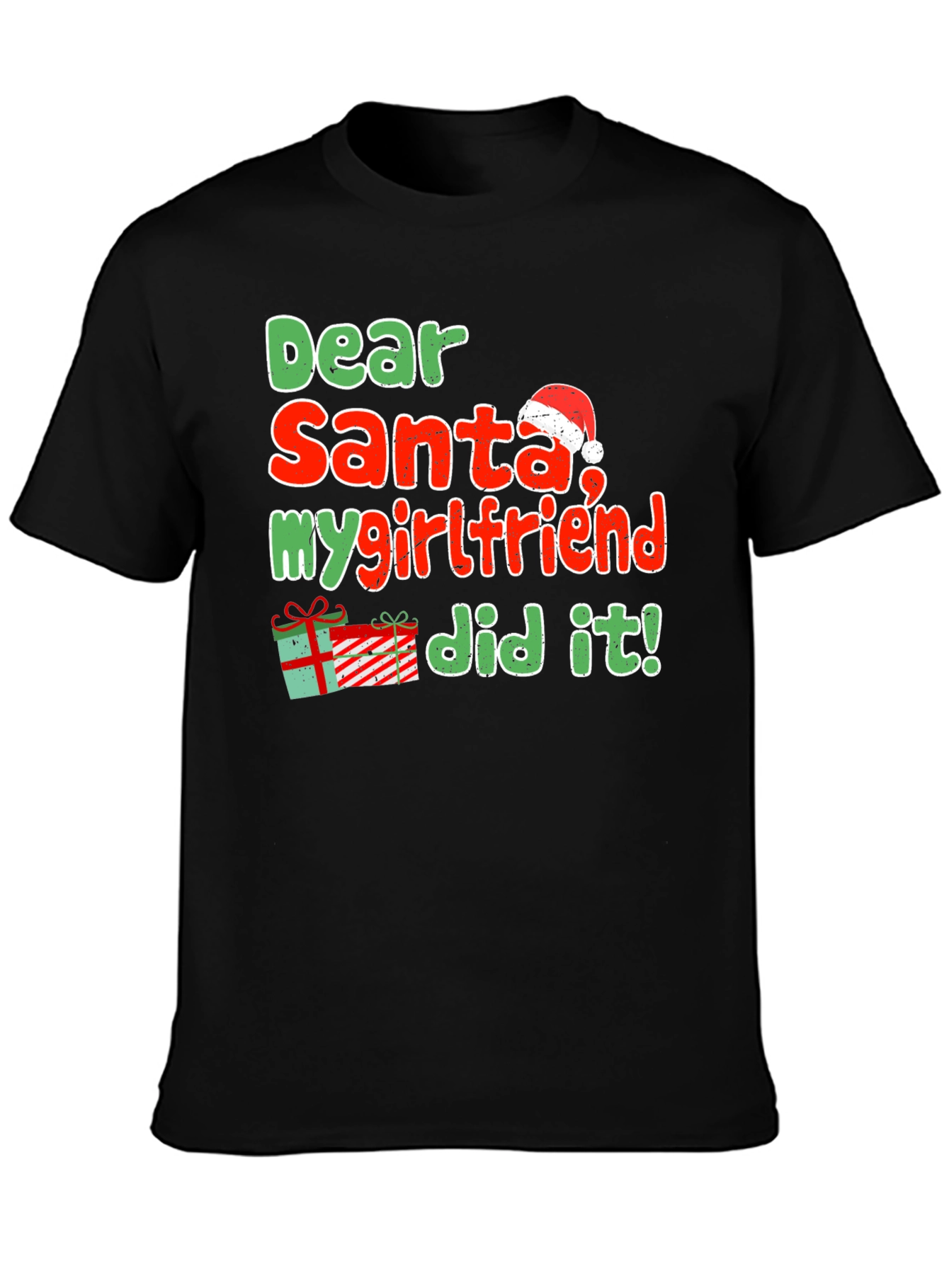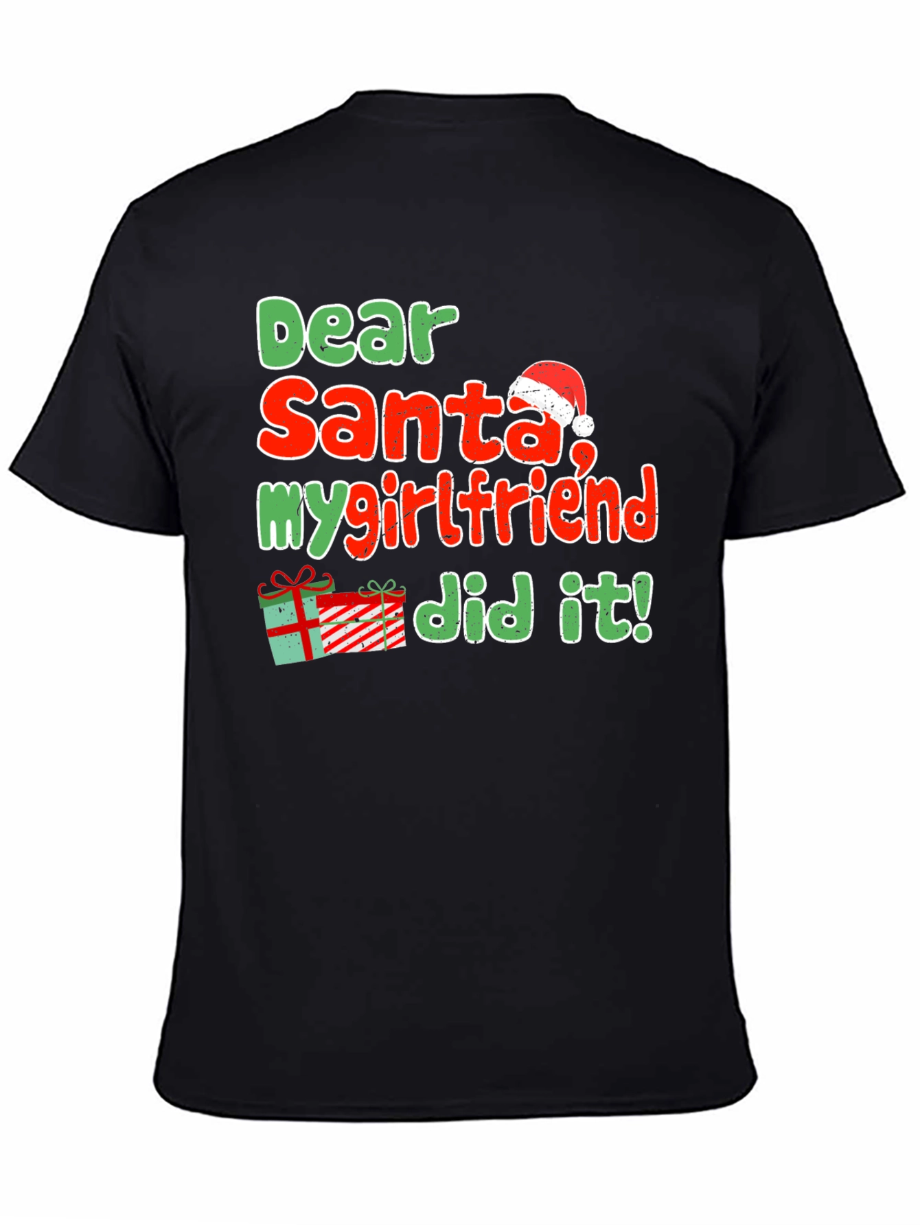 Get ready for the holiday season with this humorous black t-shirt featuring the playful message "Dear Santa, my girlfriend did it!" in festive red and green lettering. A Santa hat adorns the word "Santa," while a charming gift box graphic adds to the Christmas cheer. This short-sleeved tee appears to be made of a comfortable, breathable fabric, ideal for casual wear during holiday gatherings, parties, or relaxed days at home. The design is perfect for those with a fun-loving sense of humor and is sure to be a conversation starter. Surprise your loved ones with this witty and eye-catching tee! It would make a great Christmas gift for anyone who loves to share a laugh.