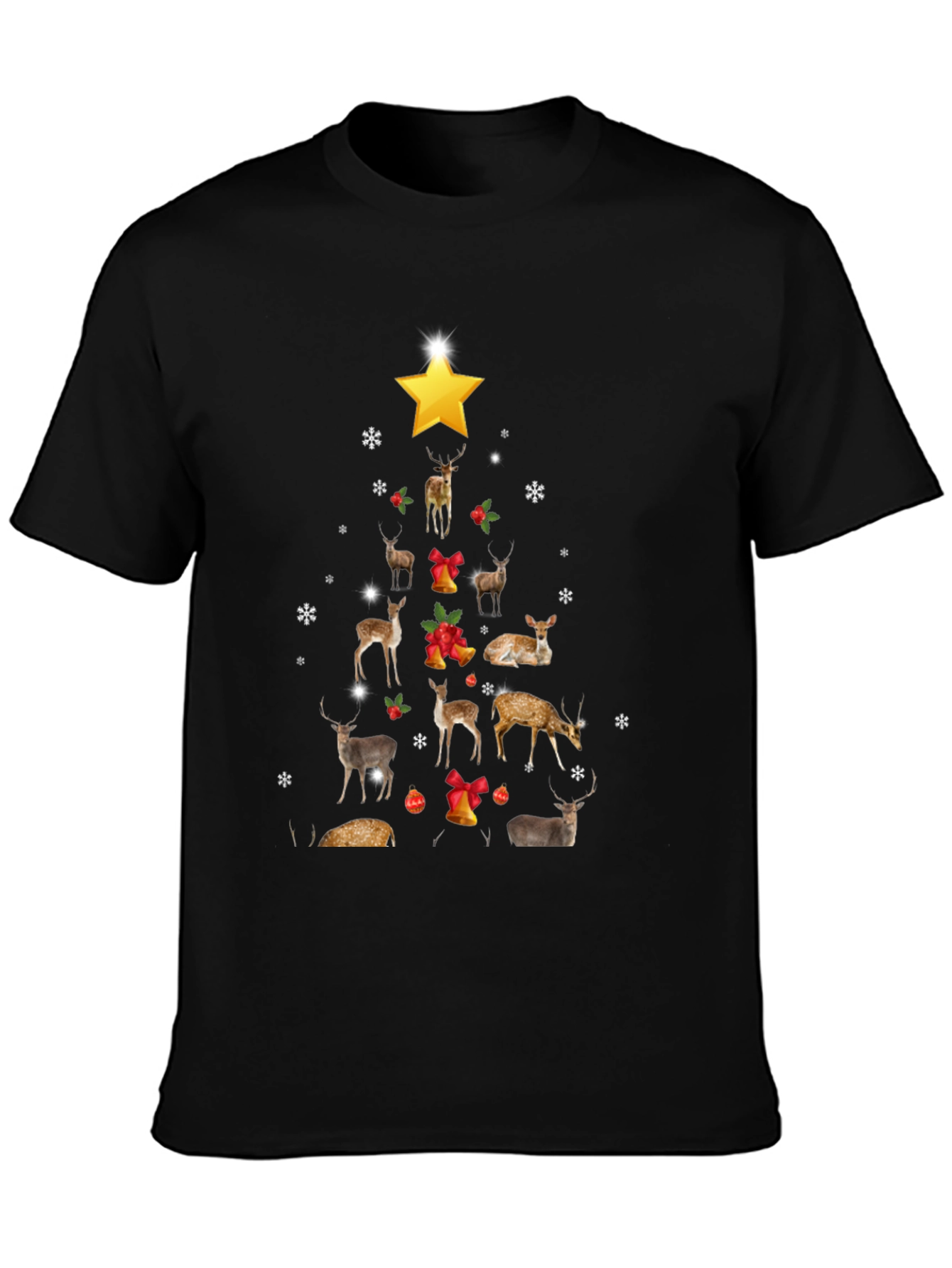Get into the holiday spirit with this unique Deer Christmas Tree T-shirt! This eye-catching black tee features a creatively designed Christmas tree comprised of various deer illustrations, festive bells, berries, and snowflakes, topped with a shining yellow star. Made from comfortable, breathable fabric, this shirt is perfect for holiday parties, casual wear, or as a fun gift for the animal lover in your life. Spread some Christmas cheer with this stylish and festive tee!
