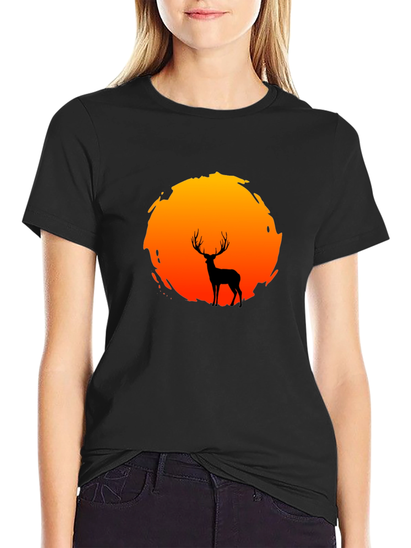 Show off your love for nature with this striking Deer Silhouette Graphic Tee. The shirt features a bold and artistic design: a majestic deer silhouette stands against a vibrant, sunset-colored circle. This eye-catching image is sure to make a statement. Made from comfortable materials, this t-shirt is perfect for everyday wear. Its classic fit makes it a versatile addition to any wardrobe. Dress it up with a jacket for a casual night out, or keep it simple with jeans for a relaxed weekend look. A must-have for nature enthusiasts and anyone who appreciates unique apparel.