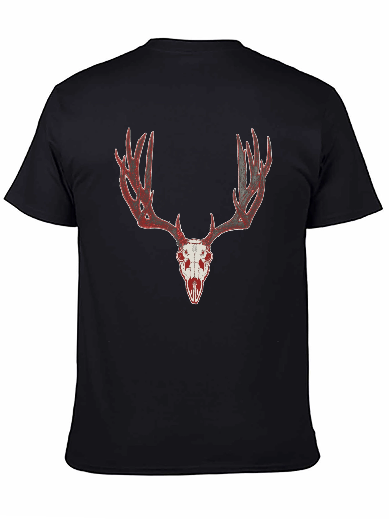 Showcase your unique style with this striking men's black t-shirt. Featuring a detailed graphic of a deer skull with intricate antler designs, this shirt is sure to turn heads. The design is printed in a distressed red and white. Made from comfortable, breathable fabric, this tee offers a relaxed fit perfect for everyday wear. Pair it with jeans or shorts for a casual yet stylish look. Ideal for nature lovers, hunters, or anyone with an appreciation for unique graphic tees. Add this bold statement piece to your wardrobe today!