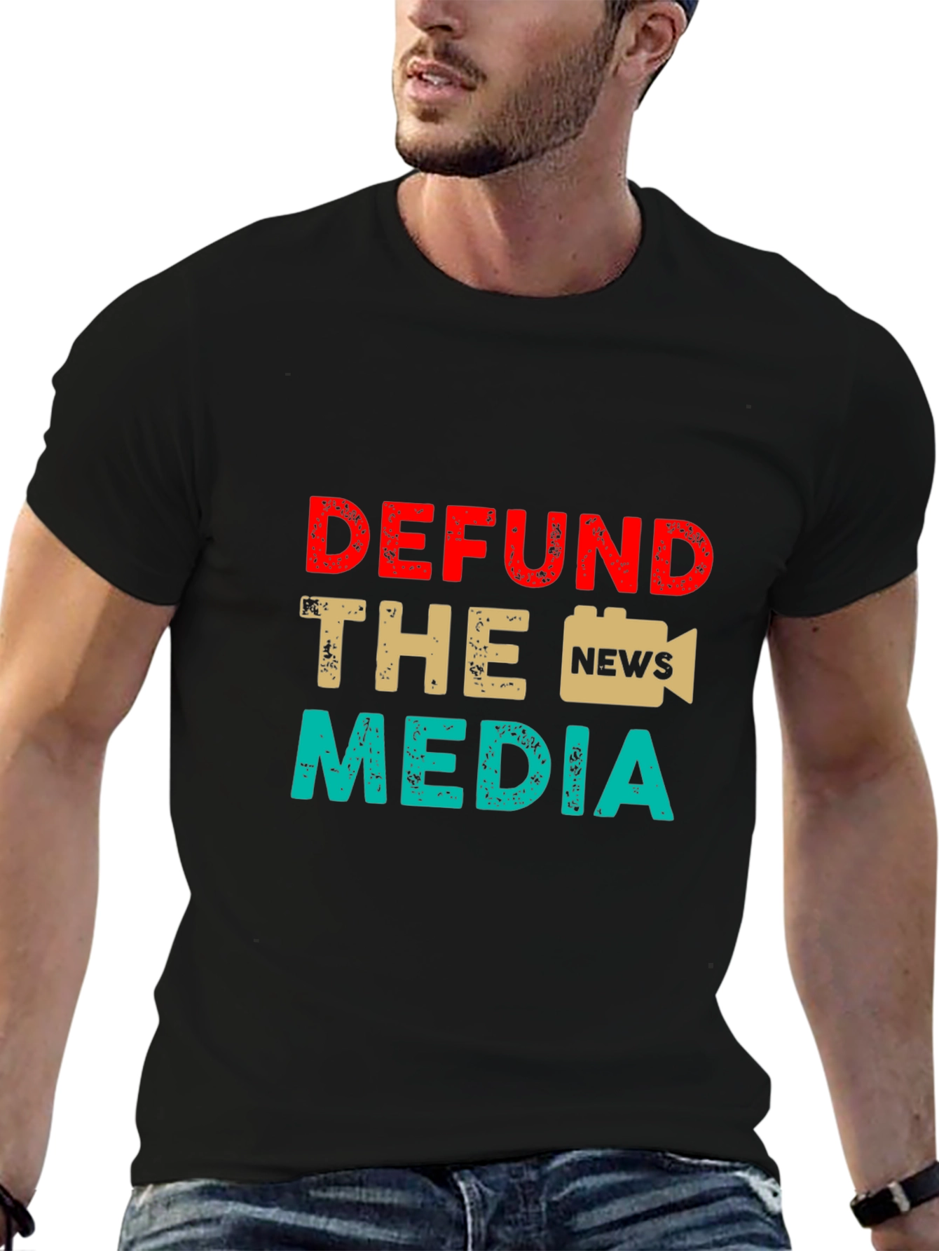 Make a bold statement with this Defund the Media T-shirt. Featuring a distressed-style graphic print with red 'DEFUND,' beige 'THE NEWS,' and teal 'MEDIA' text, along with a camera icon, this tee is perfect for those who want to express their views. The design is printed on a black, soft-fabric t-shirt with a classic fit. Ideal for casual wear, political events, or everyday expression. Show your stance with this unique and eye-catching shirt.