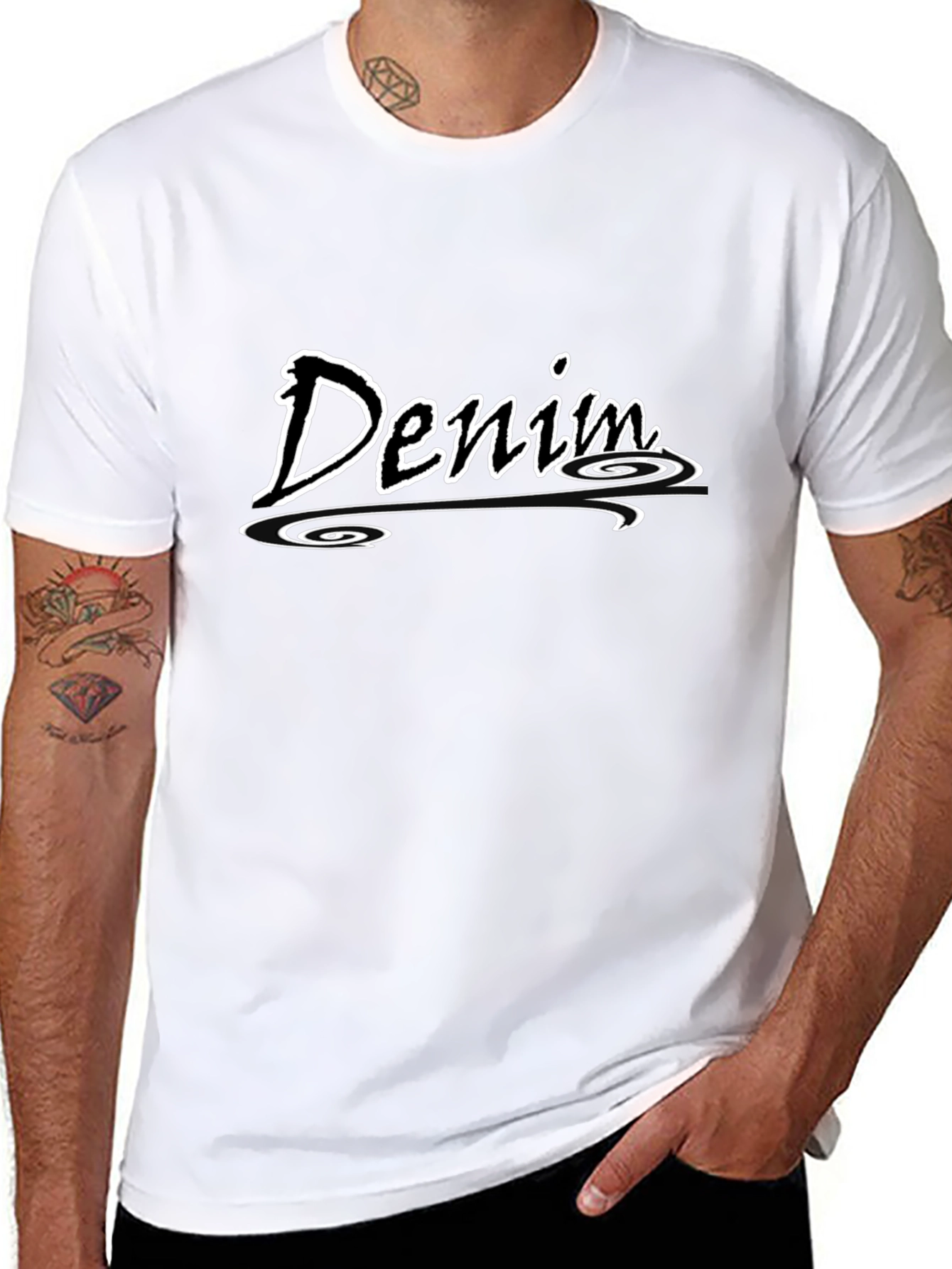 Elevate your casual style with this classic black t-shirt. Featuring a bold white "Denim" graphic with a stylized water ripple design, this shirt adds a touch of effortless cool to any outfit. Crafted from a comfortable and breathable fabric, it's perfect for everyday wear. Pair it with your favorite jeans or shorts for a relaxed yet stylish look. This tee is ideal for casual outings, concerts, or simply lounging around in comfort.