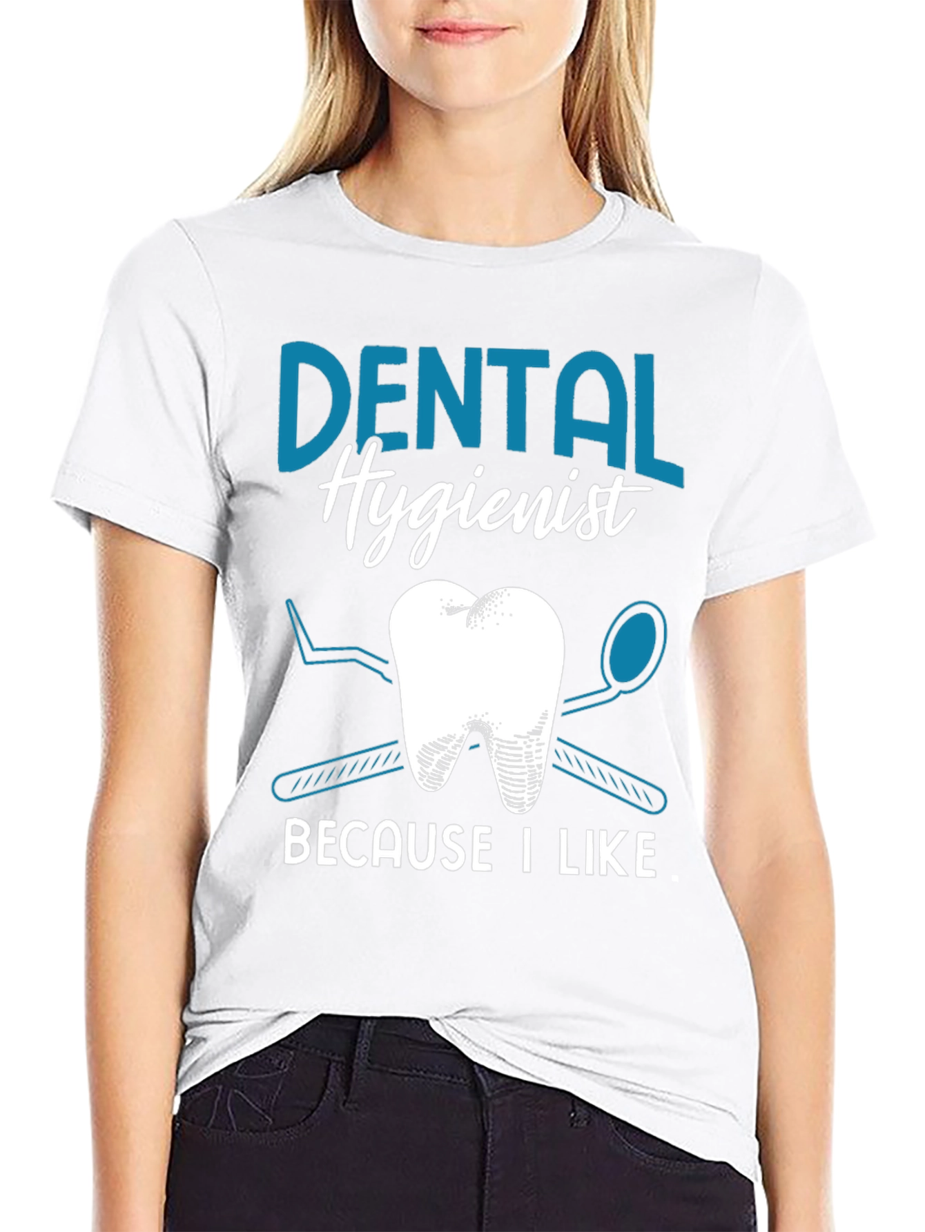 Show off your love for dental hygiene with this stylish black T-shirt! Featuring a bold "Dental Hygienist" graphic in eye-catching teal, this shirt also showcases a whimsical tooth design crossed with dental tools. Below the graphic, "BECAUSE I LIKE" is printed, playfully completing the message. Made from a soft, comfortable fabric, this tee is perfect for casual wear or to show your pride at work. A unique and fun gift idea for the dental hygienist in your life, or for yourself! Get yours today and let everyone know you're passionate about pearly whites.