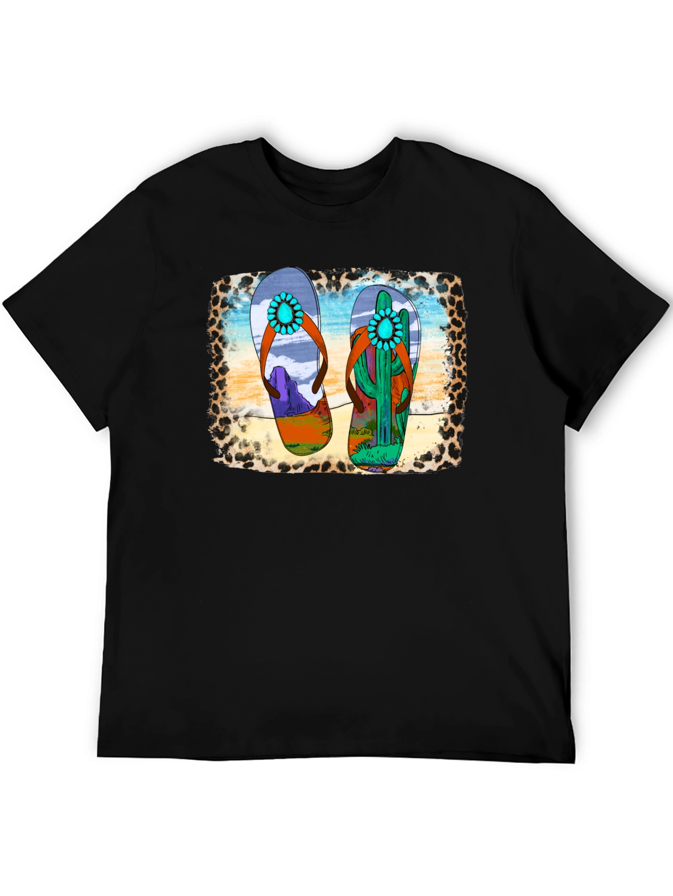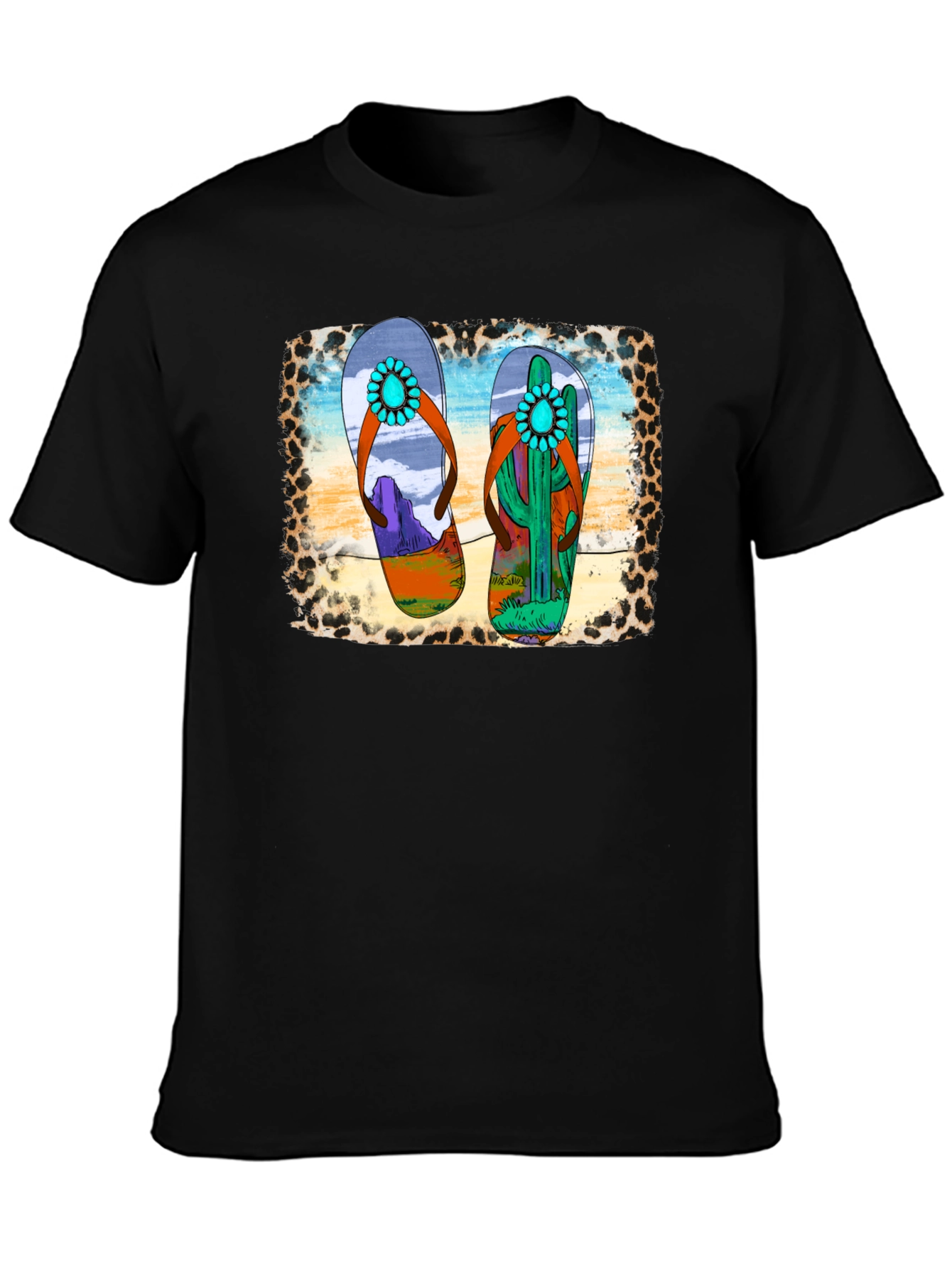 Step into summer with this unique black graphic tee! Featuring a vibrant design of flip flops showcasing a beautiful desert landscape complete with cacti and mountains. The print is framed by a cheetah print background. Made from soft, comfortable fabric, this tee is perfect for casual wear, beach outings, or adding a touch of Southwestern flair to your wardrobe. It's a stylish way to show off your love for the desert and makes a great gift for nature enthusiasts. Pair it with jeans, shorts, or a skirt for a relaxed and trendy look.