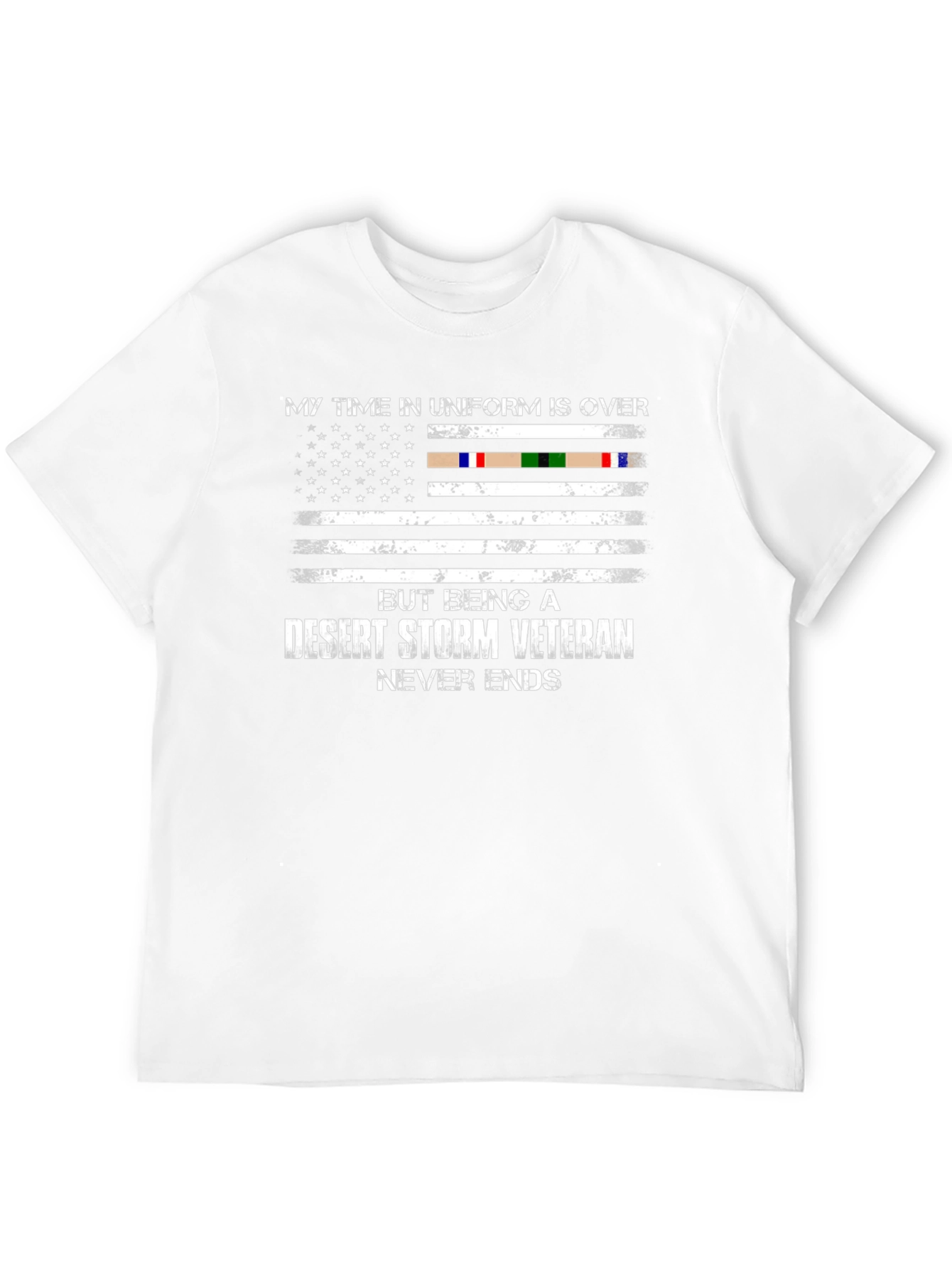 Show your pride with this Desert Storm Veteran T-shirt. The design features a distressed USA flag with military ribbons, accompanied by the powerful statement "My time in uniform is over, but being a Desert Storm Veteran never ends". Made from comfortable, breathable cotton, this classic black tee is perfect for everyday wear or special occasions. A great way to honor your service and connect with fellow veterans. Makes a thoughtful gift for any Desert Storm Veteran. Wear it with pride and let everyone know you served!