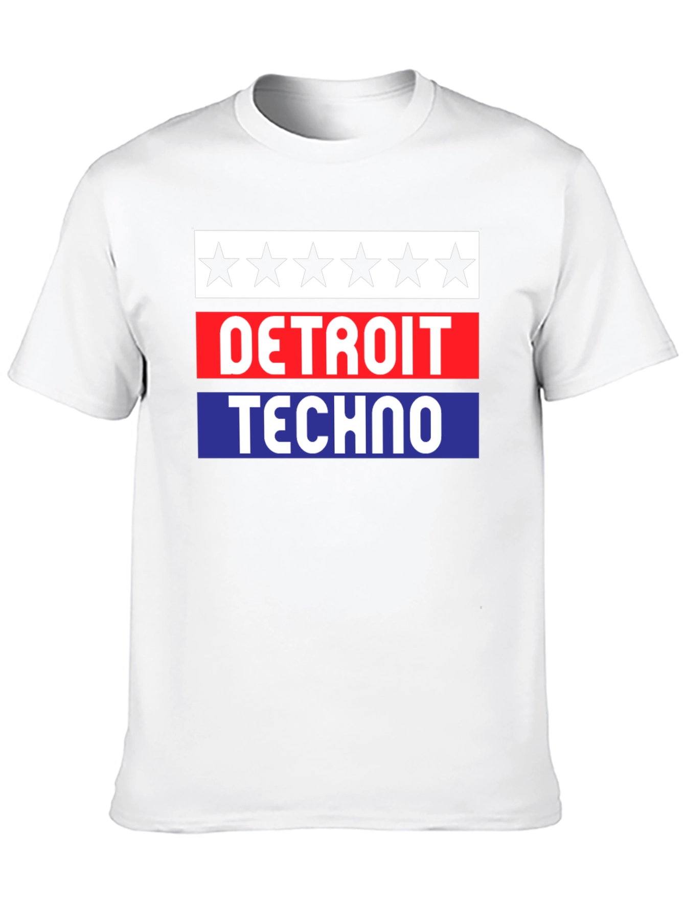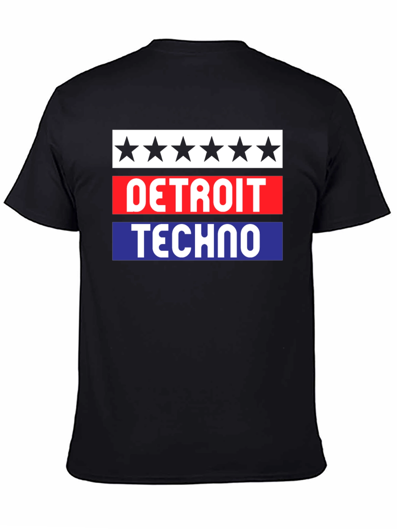 Show your love for Detroit Techno with this stylish graphic t-shirt. Made from a comfortable, breathable fabric (likely cotton or a cotton blend), this tee features a bold design with white stars, the words 'DETROIT' in red, and 'TECHNO' in blue, all printed in a striking, eye-catching font. The classic black color makes it versatile for everyday wear. Perfect for music lovers, DJs, or anyone who appreciates the iconic Detroit sound. Wear it to concerts, clubs, or casual outings. This t-shirt is a great way to express your passion for techno music and the Motor City. Grab yours and let the rhythm move you!