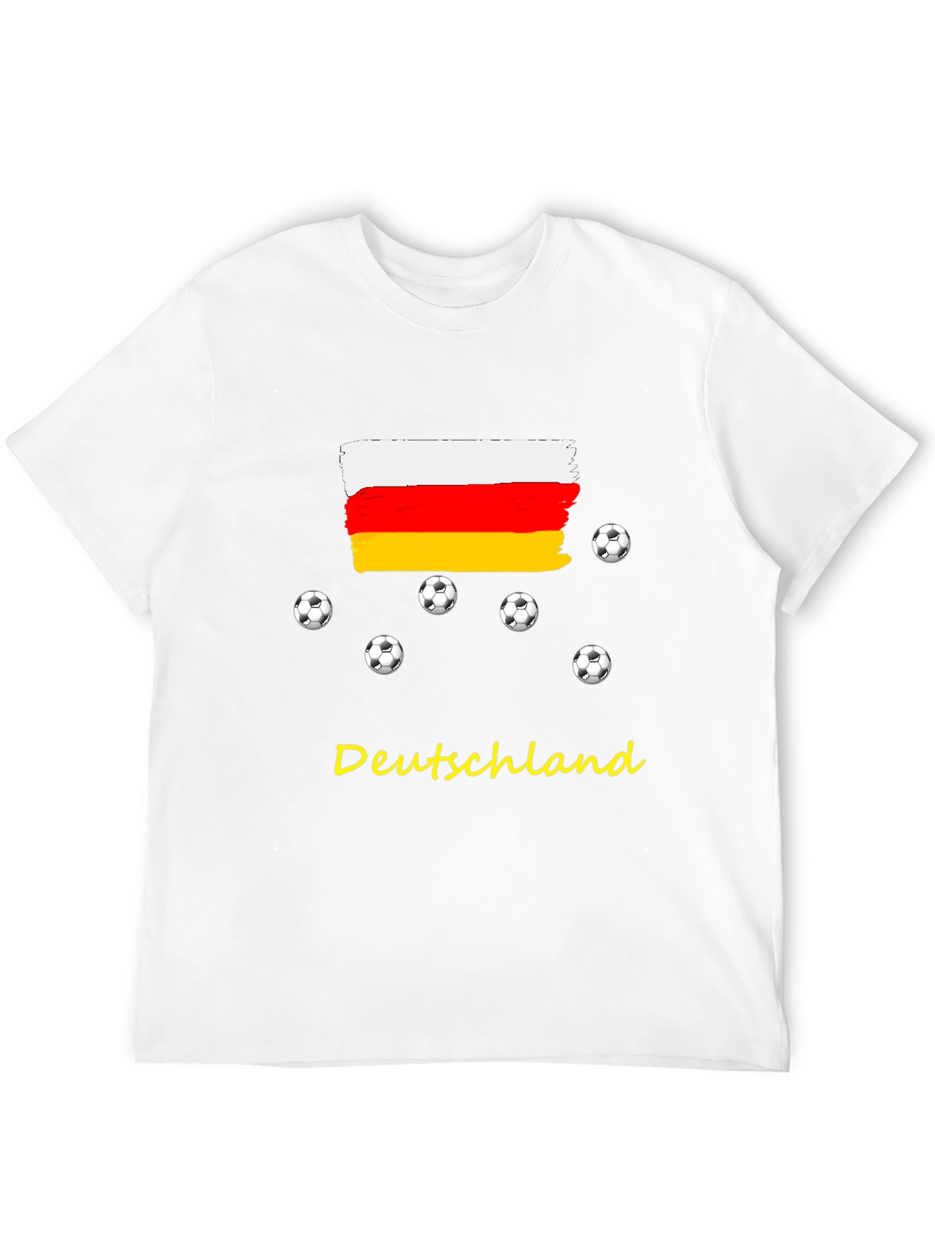Show your support for German soccer with this stylish black T-shirt. The shirt features a striking design of the German flag with a distressed, painted effect, accompanied by scattered soccer ball graphics. "Deutschland" is boldly printed in yellow beneath the flag. Perfect for game days, sports bars, or casual wear, this comfortable tee is a great way to display your love for German football. Made from a soft, breathable fabric, this shirt offers both comfort and style. Whether you're cheering from the stands or watching from home, show your pride with this unique T-shirt.