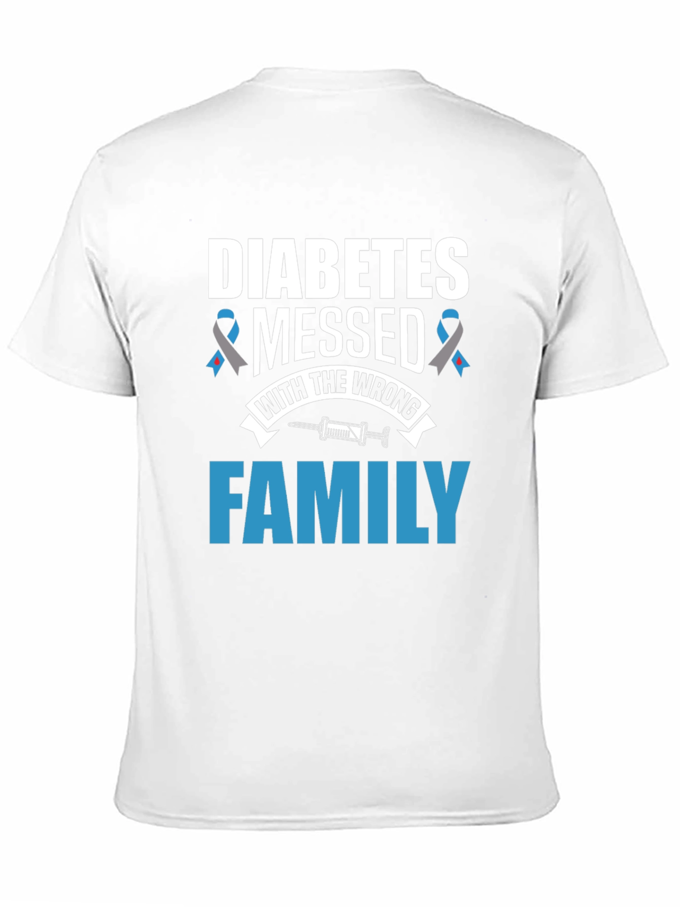 Show your support with this black t-shirt featuring a powerful message: "Diabetes Messed With The Wrong Family." The design includes blue diabetes awareness ribbons and a subtle medical syringe graphic. Made from comfortable, breathable fabric, this shirt is perfect for awareness walks, family gatherings, or everyday wear. Let everyone know that your family faces diabetes head-on and remains strong! A thoughtful gift for loved ones or a meaningful addition to your wardrobe.