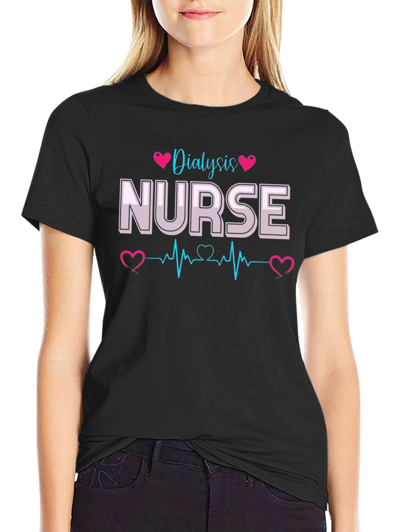Show your appreciation for dialysis nurses with this stylish black t-shirt. Featuring a vibrant design with "Dialysis Nurse" text, adorned with cute hearts and a heartbeat graphic, this tee is perfect for everyday wear. The text has a outlined style that makes it visually appealing. Made from comfortable and breathable fabric, this shirt is ideal for nurses, healthcare professionals, or anyone who wants to support the dialysis community. It's a thoughtful gift for nurses week, birthdays, or just to show your gratitude for the amazing work they do. Wear it with pride and make a statement!