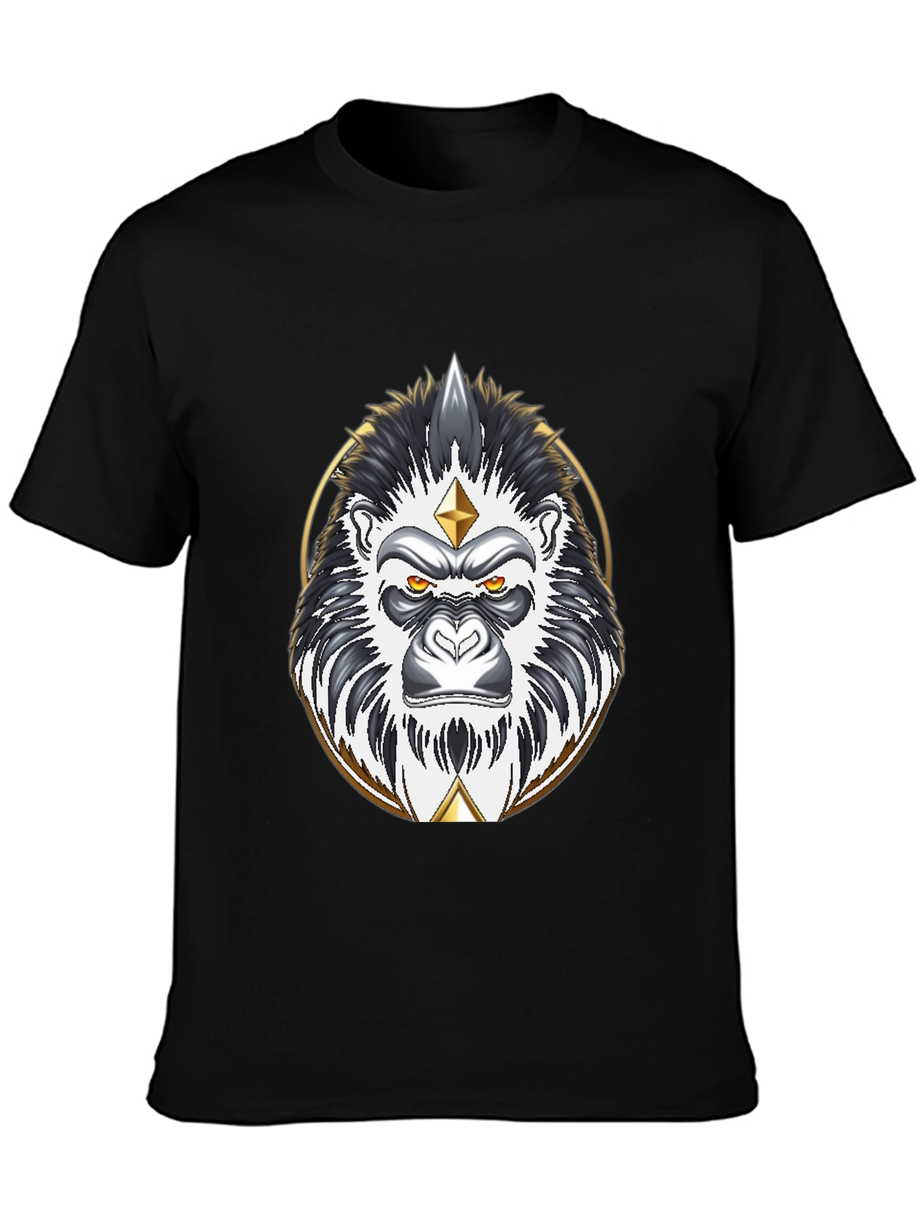 Showcase your style with this unique black t-shirt featuring a striking diamond gorilla graphic. The design incorporates a detailed gorilla head with a diamond accent, set against a gold halo. The monochrome color scheme with metallic highlights adds a touch of modern flair. Made from a soft, breathable fabric, this tee offers both comfort and durability. Perfect for casual outings, concerts, or making a bold statement wherever you go. Express your individuality with this eye-catching gorilla graphic tee!