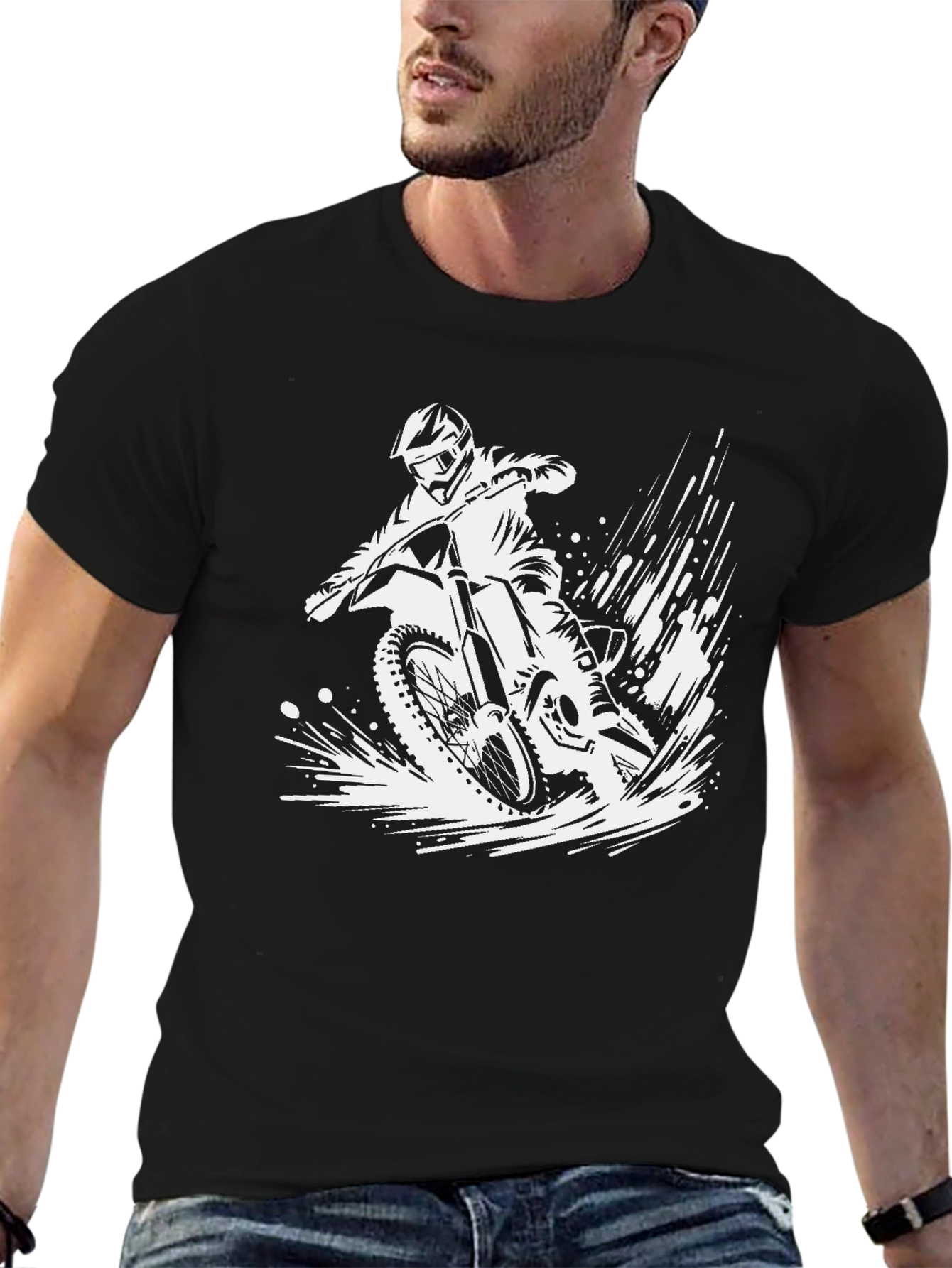 Showcase your love for motocross with this bold graphic tee. Featuring a striking design of a dirt bike rider in action, this tee is perfect for casual wear or making a statement. The crisp white graphic pops against the black background, offering a stylish contrast. Made from comfortable materials, it's ideal for everyday wear or hitting the trails. A must-have for any motocross enthusiast's wardrobe. Machine washable for easy care.