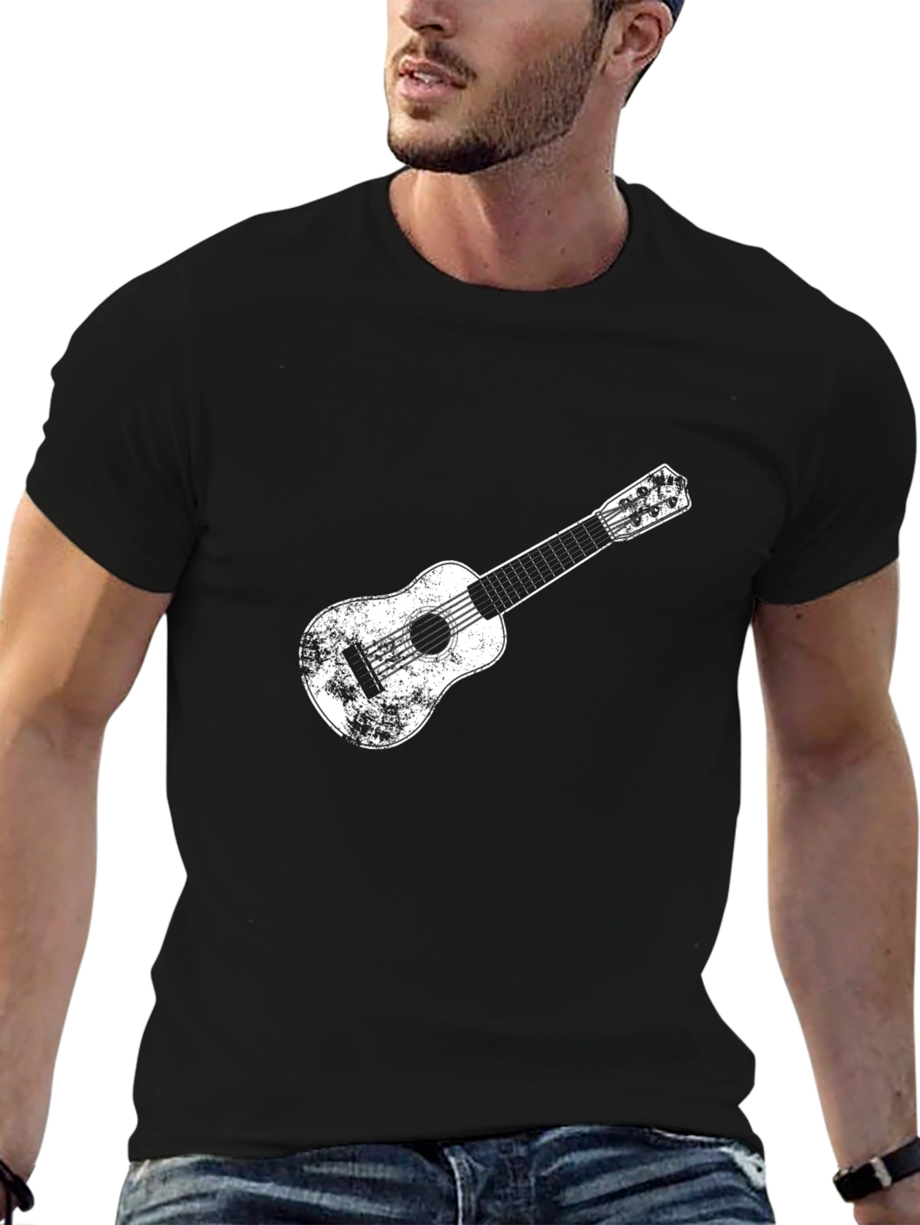 Rock a vintage vibe with this black t-shirt featuring a distressed white guitar graphic. The classic crew neck and short sleeve design offers a comfortable, casual fit for everyday wear. This unique tee adds an edgy musical touch to your wardrobe. Perfect for musicians, music lovers, or anyone who appreciates cool graphic tees. Pair it with jeans or shorts for a relaxed, stylish look. Soft fabric ensures all-day comfort, while the bold graphic makes a statement. Ideal for casual outings, concerts, or simply expressing your love for music.