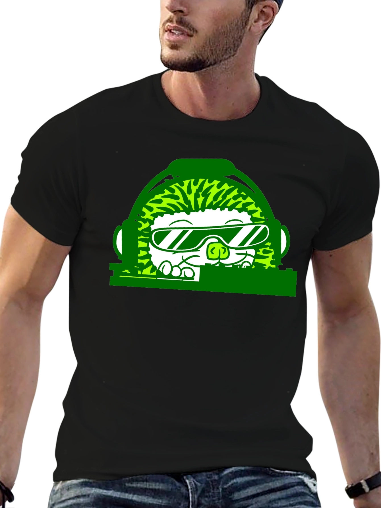 This unique black t-shirt features a vibrant green graphic design of a hedgehog wearing headphones and sunglasses, seemingly DJing at a turntable. The design is bold and eye-catching, making this tee a standout piece. Made from what appears to be a soft and comfortable fabric, it is perfect for everyday wear. This t-shirt is a fun and playful choice for anyone who loves music, animals, or quirky graphic designs. Whether you're hitting the club, lounging at home, or want to add some personality to your wardrobe, this DJ hedgehog t-shirt is sure to be a hit. It's also a great conversation starter and a fun gift idea.