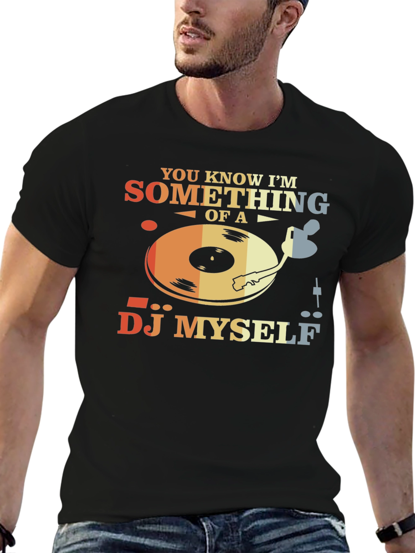 Show off your love for music with this eye-catching "You Know I'm Something of a DJ Myself" graphic tee. This black t-shirt features a vibrant, retro-inspired design of a turntable and vinyl record, creating a vintage feel. Perfect for music enthusiasts and DJs, this shirt is made from comfortable fabric that ensures a great fit and feel. Wear it to concerts, parties, or casual outings to express your passion for DJing. A stylish addition to any wardrobe, this tee combines comfort and personality in one unique piece. Get yours today and let everyone know you're a DJ at heart!