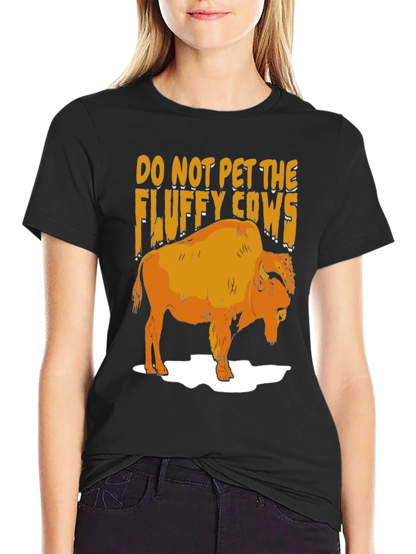This stylish black t-shirt features a bold and humorous design, perfect for animal lovers and those with a quirky sense of humor. The shirt prominently displays the text "DO NOT PET THE FLUFFY COWS" in a distressed, eye-catching font above an illustration of a buffalo. Made from what appears to be soft and comfortable cotton, this tee offers a relaxed fit ideal for everyday wear. It's a great conversation starter and a fun addition to any casual wardrobe. Wear it to the zoo, a casual hangout, or just around town to spread some laughter.
