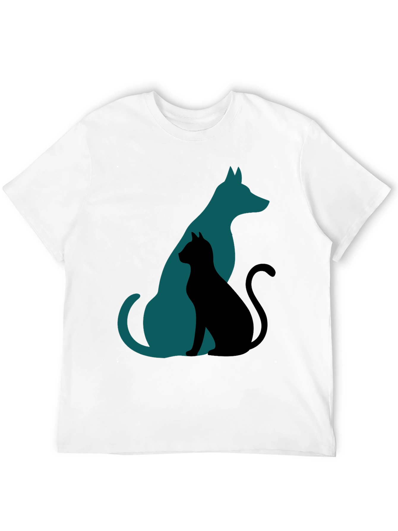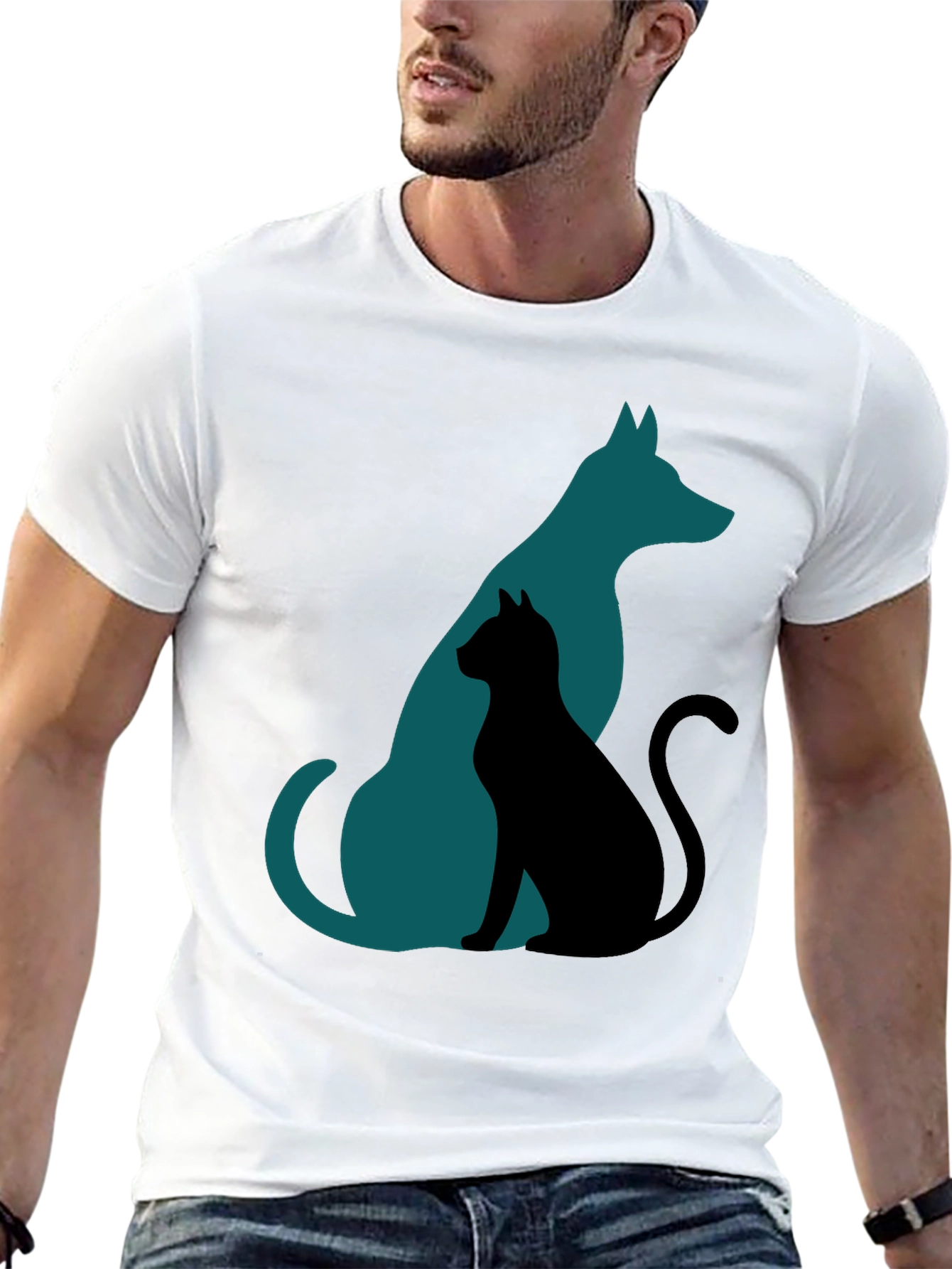 Show off your love for furry friends with this stylish men's t-shirt. The tee features a striking silhouette design of a teal-colored dog with a black cat in front of it. The solid black t-shirt provides a sleek and modern backdrop for the unique graphic. Made from comfortable, breathable fabric, it's perfect for everyday wear. Whether you're a pet owner or simply an animal lover, this tee is a great way to express your passion. Ideal for casual outings, errands, or lounging at home. Pair it with jeans, shorts, or joggers for a versatile, trendy look. Add it to your wardrobe today!