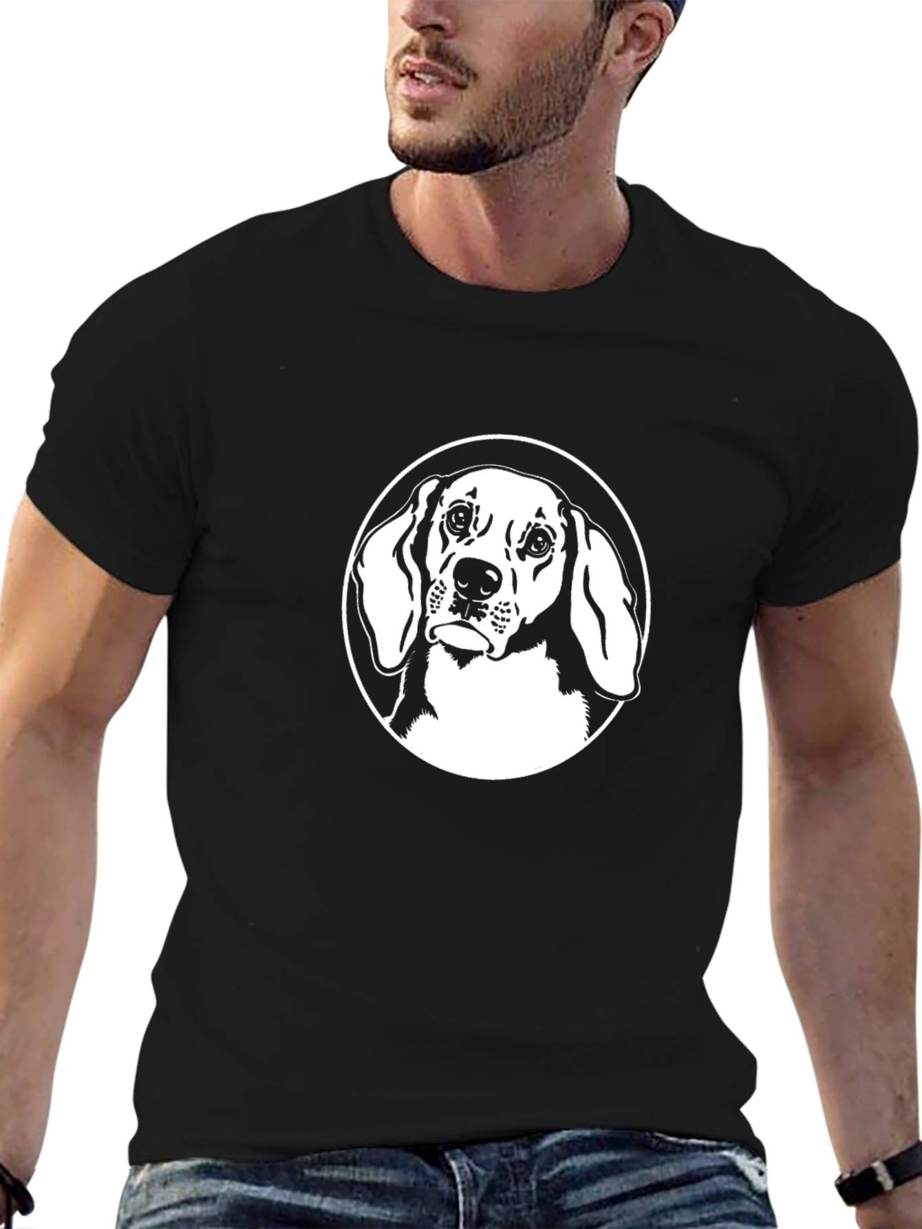 Show off your love for canines with this stylish black t-shirt. The shirt features a striking white graphic of a dog's head, encircled in a clean, modern design. Made from comfortable cotton material, this tee is perfect for everyday wear. The classic black color makes it versatile to pair with any outfit, while the eye-catching dog graphic adds a touch of personality. Ideal for casual outings, dog park visits, or simply lounging at home, this t-shirt is a must-have for any dog lover's wardrobe. It's a comfortable and cool way to express your passion for your furry friend!